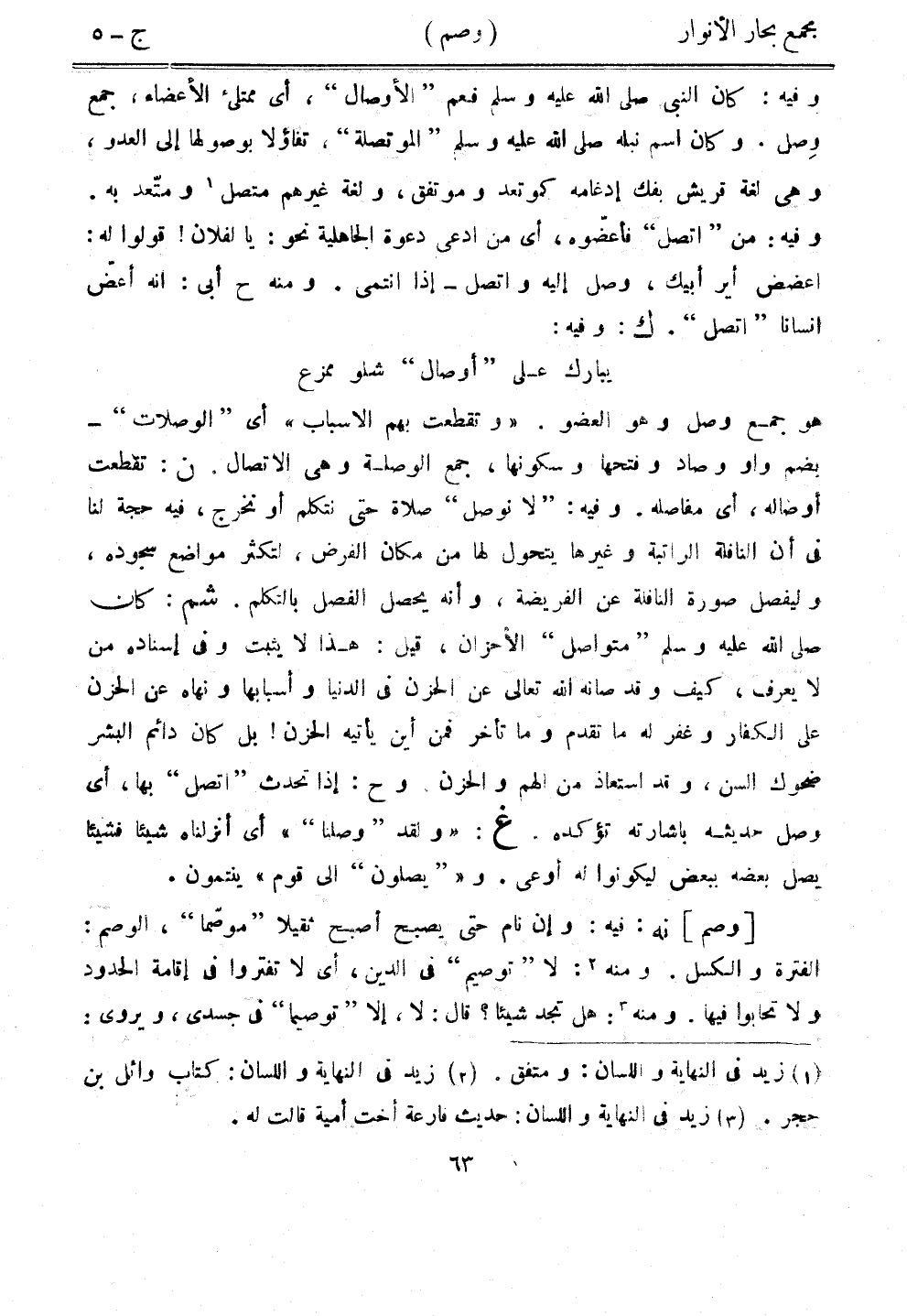 هو جمع وصل وهو العضو. "وتقطعت بهم الأسباب" أي "الوصلات"- بضم واو وصاد وفتحها وسكونها، جمع الوصلة وهي الاتصال. ن: تقطعت أوصاله، أي مفاصله. وفيه: "لا نوصل" صلاة حتى نتكلم أو نخرج، فيه حجة لنا في أن النافلة الراتبة وغيرها يتحول لها من مكان الفرض، لتكثر مواضع سجوده، وليفصل صورة النافلة عن الفريضة، وأنه يحصل الفصل بالتكلم. شم: كان صلى الله عليه وسلم "متواصل" الأحزان، قيل: هذا لا يثبت وفي إسناده من لا يعرف، كيف وقد صانه الله تعالى عن الحزن في الدنيا وأسبابها ونهاه عن الحزن على الكفار وغفر له ما تقدم وما تأخر فمن أين يأتيه الحزن! بل كان دائم البشر ضحوك السن، وقد استعاذ من الهم والحزن. وح: إذا تحدث "اتصل" بها، أي وصل حديثه بإشارته تؤكده. غ: "ولقد "وصلنا"" أي أنزلناه شيئًا فشيئًا يصل بعضه ببعض ليكونوا له أوعى. و""يصلون" إلى قوم" ينتمون.