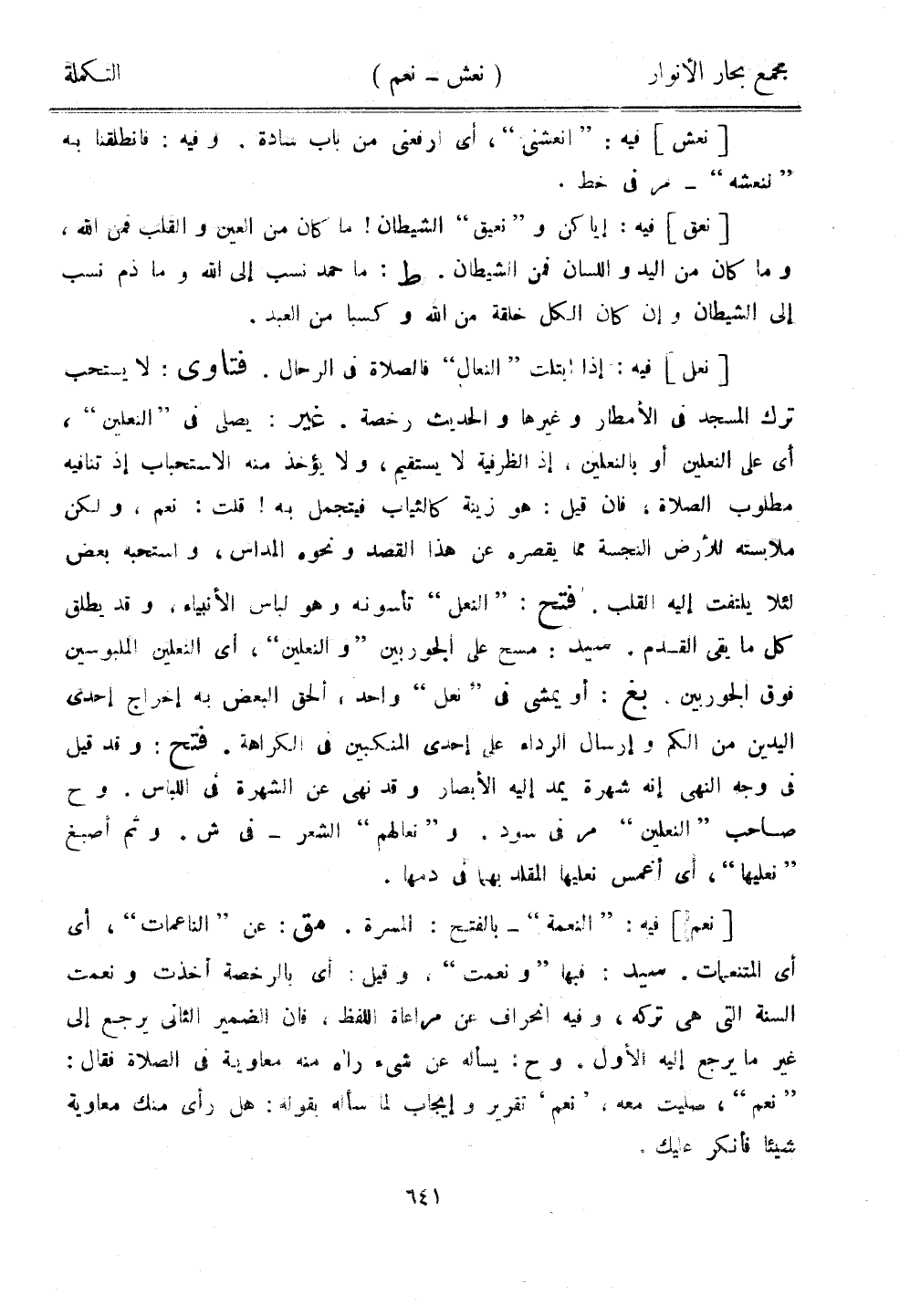 [نعل] فيه: إذا ابتلت "النعال" الصلاة في الرحال. فتاوى: لا يتسحب ترك المسجد في الأمطار وغيرها والحديث رخصة. غير: يصلي في "النعلين"، أي على النعلين أو بالنعلين، إذ الظرفية لا يستقيم، ولا يؤخذ منه الاستحباب إذ تنافه مطلوب الصلاة، فإن قيل: هو زينة كالثياب فيتجمل به! قلت: نعم، ولكن ملابسته للأرض النجسة مما يقصره عن هذا القصد ونحوه المداس، واستحبه بعض لئلا يلتفت إليه القلب. فتح: "النعل" تأسونه وهو لباس الأنبياء، وقد يطلق كل ما بقي القدم. سيد: مسح على الجوربين "والنعلين"، أي النعلين الملبوسين فوق الجوربين. بغ: أو يمشي في "نعل" واحد، ألحق البعض به إخراج إحدى اليدين من الكم وإرسال الرداء على إحدى المنكبين في الكراهة. فتح: وقد قيل فيوجه النهي إنه شهرة يمد إليه الأبصار وقد نهى عن الشهرة في اللباس. وح صاحب "النعلين" مر في سود. و"نعالهم" الشعر - في ش. وثم أصبغ "فعليها"، أي أغمس نعليها المقلد بهما في دمها.