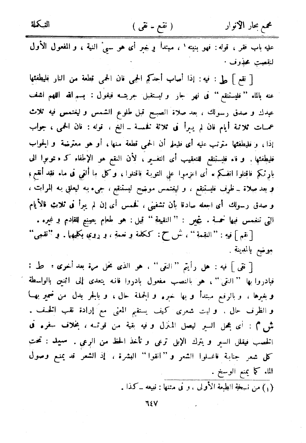 [نقع] ط: فيه: إذا أصاب أحدكم الحمى فإن الحمى قطعة من النار فليطفئها عنه بالماء "فليستنقع" في نهر جار وليستقبل جريته فيقول: بسم الله اللهم اشف عبدك وصدق رسولك، بعد صلاة الصبح قبل طلوع الشمس وليغتمس فيه ثلاث غمسات ثلاثة أيام فإن لم يبرأ في ثلاثة فخمسة-إلخ، قوله: فإن الحمى، جواب إذا، وفليطفئها مترتب عليه أي فليعلم أن الحمى قطعة منها، أو هو معترضة والجواب فليطفئها. وفاء فليستنقع للتعقيب أي التفسير، لأن النقع هو الإطفاء كـ"توبوا إلى بارئكم فاقتلوا أنفسكم" أي اعزموا على التوبة فاقتلوا، وكل ما ألقى في ماء فقد أنقع، وبعد صلاة - ظرف فليستنقع، وليغتمس موضع ليستنقع، جيء به ليعلق به المرات، وصدق رسولك أي اجعله صادقًا بأن تشفيني، فخمس أي إن لم يبرأ في ثلاث فالأيام التي تنغمس فيه خمسة. غير: "النقيعة" قيل: هو طعام يصنع للقادم وغيره.