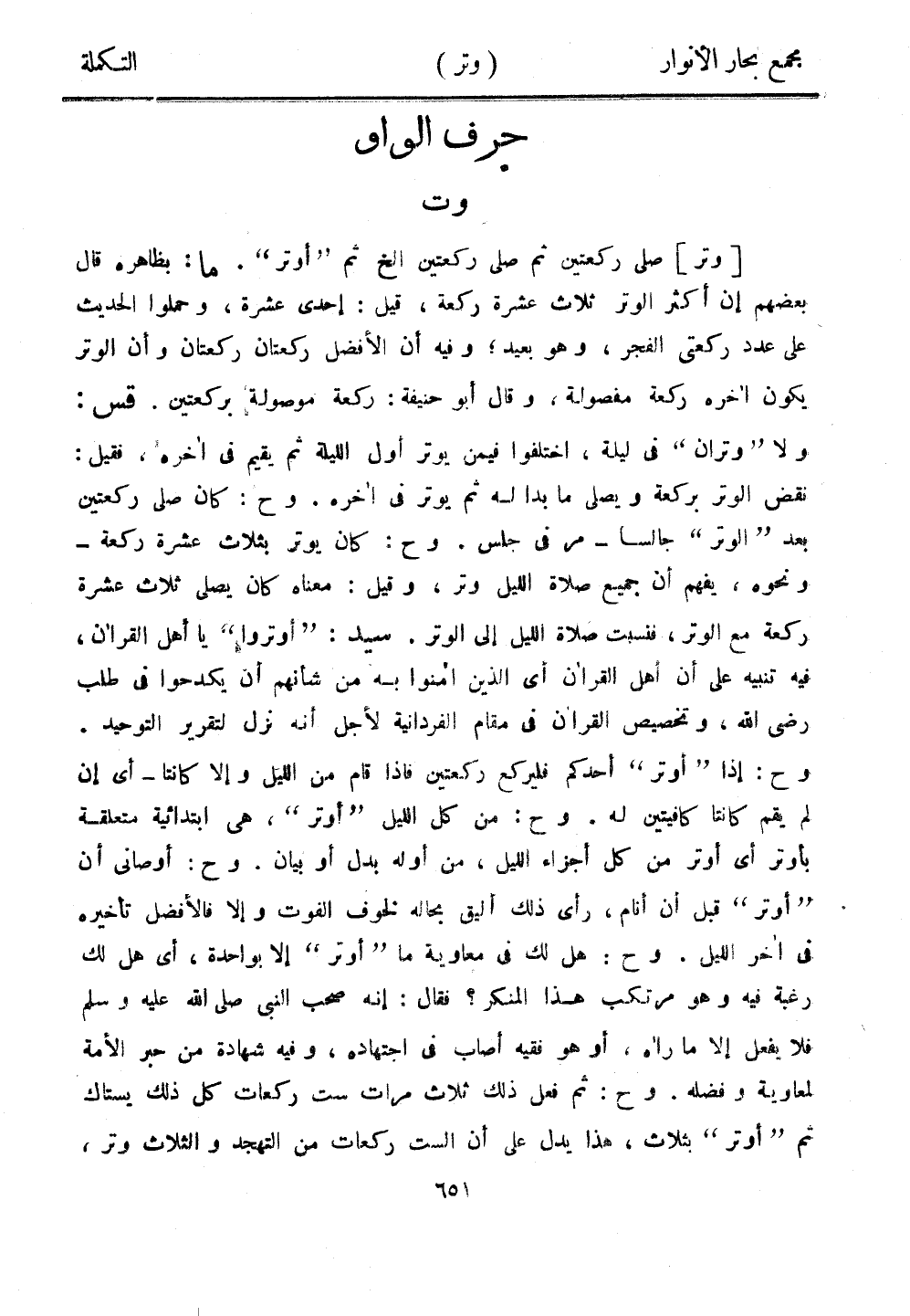 [وتر] صلى ركعتين ثم صلى ركعتين إلخ ثم "أوتر". ما: بظاهره قال بعضهم إن أكثر الوتر ثلاث عشرة ركعة، قيل: إحدى عشرة، وحملوا الحديث على عدد ركعتي الفجر، وهو بعيد؛ وفيه أن الأفضل ركعتان ركعتان وأن الوتر يكون أخره ركعة مفصولة، وقال أبوحنيفة: ركعة موصولة بركعتين. قس: ولا "وتران" في ليلة، اختلفوا فيمن يوتر أول الليلة ثم يقيم في آخره، فقيل: نقض الوتر بركعة ويصلي ما بدا له ثم يوتر في آخره، فقيل: نقض الوتر بركعة ويصلي ما بدا له ثم يوتر في آخره. وح: كان صلى ركعتين بعد "الوتر" جاسًا - مر في جس. وح: كان يوتر بثلاث عشرة ركعة - ونحوه، يفهم أن جميع صلاة الليل وتر، وقيل: معناه كان يصلي ثلاث عشرة ركعة مع الوتر، فنسبت صلاة الليل على الوتر. سيد: "أوتروا" يا أهل القرآن، فيه تنبيه على أن أهل القرآن أي الذين آمنوا به من شأنهم أن يكدحوا في طلب رضي الله، وتخصيص القرآن في مقام الفردانية لأجل أنه نزل لتقرير التوحيد. وح: إذا "أوتر" أحدكم فليركع ركعتين فإذا قام من الليل وإلا كانتا- أي إن لم يقم كانتا كافيتين له. وح: من كل الليل "أوتر"، هي ابتدائية متعلقة بأوتر أي أوتر من كل أجزاء الليل، من أوله بدل أو بيان. وح: أوصاني أن "أوتر" قبل أن أنام، رأى ذلك أليق بحاله لخوف الفوت وإلا فالأفضل تأخيره في آخر الليل. وح: هل لك في معاوية ما "أوتر" إلا بواحدة، أي هل لك رغبة فيه وهو مرتكب هذا المنكر؟ فقال: إنه صحب النبي صلى الله عليه وسلم فلا يفعل إلا ما رآه، أو هو فقيه أصاب في اجتهاده، وفيه شهادة من حبر الأمة لمعاوية وفضله. وح: ثم فعل ذلك ثلاث مرات ست ركعات كل ذلك يستاك ثم "أوتر" بثلاث، هذا يدل على أن الست ركعات من التهجد والثلاث وتر،