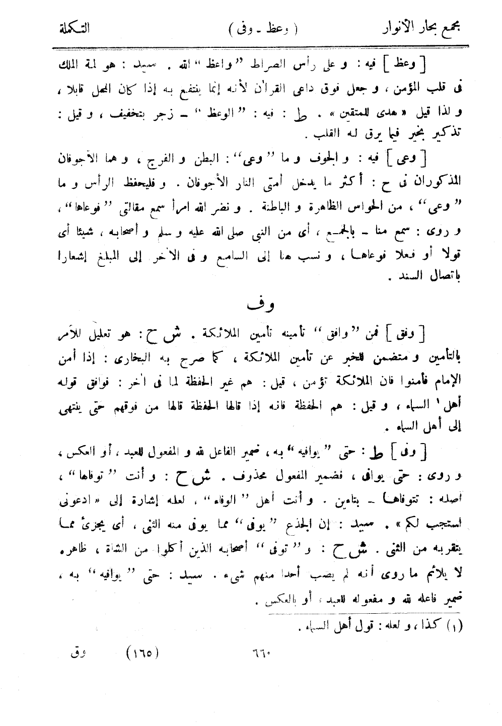 [وفى] ط: حتى "يوافيه" به، ضمير الفاعل لله والمفعول للعبد، أو العكس، وروي: حتى يوافي، فضمير المفعول محذوف. ش ح: وأنت "توفاها"، أصله: تتوفاها - بتاءين. وأنت أهل "الوفاء"، لعله إشارة على "ادعوني استجب لكم". سيد: إن الجذع "يوفى" مما يوفى منه الثني، أي يجزئ مما يتقربه من الثني. ش ح: "و"توفى" أصحابه الذين أكلوا من الشاة، ظاهره لا يلائم ما روى أنه لم يصب أحدًا منهم شيء. سيد: حتى "يوافيه" به، ضمير فاعله لله ومفعوله للعبد، أو بالعكس.