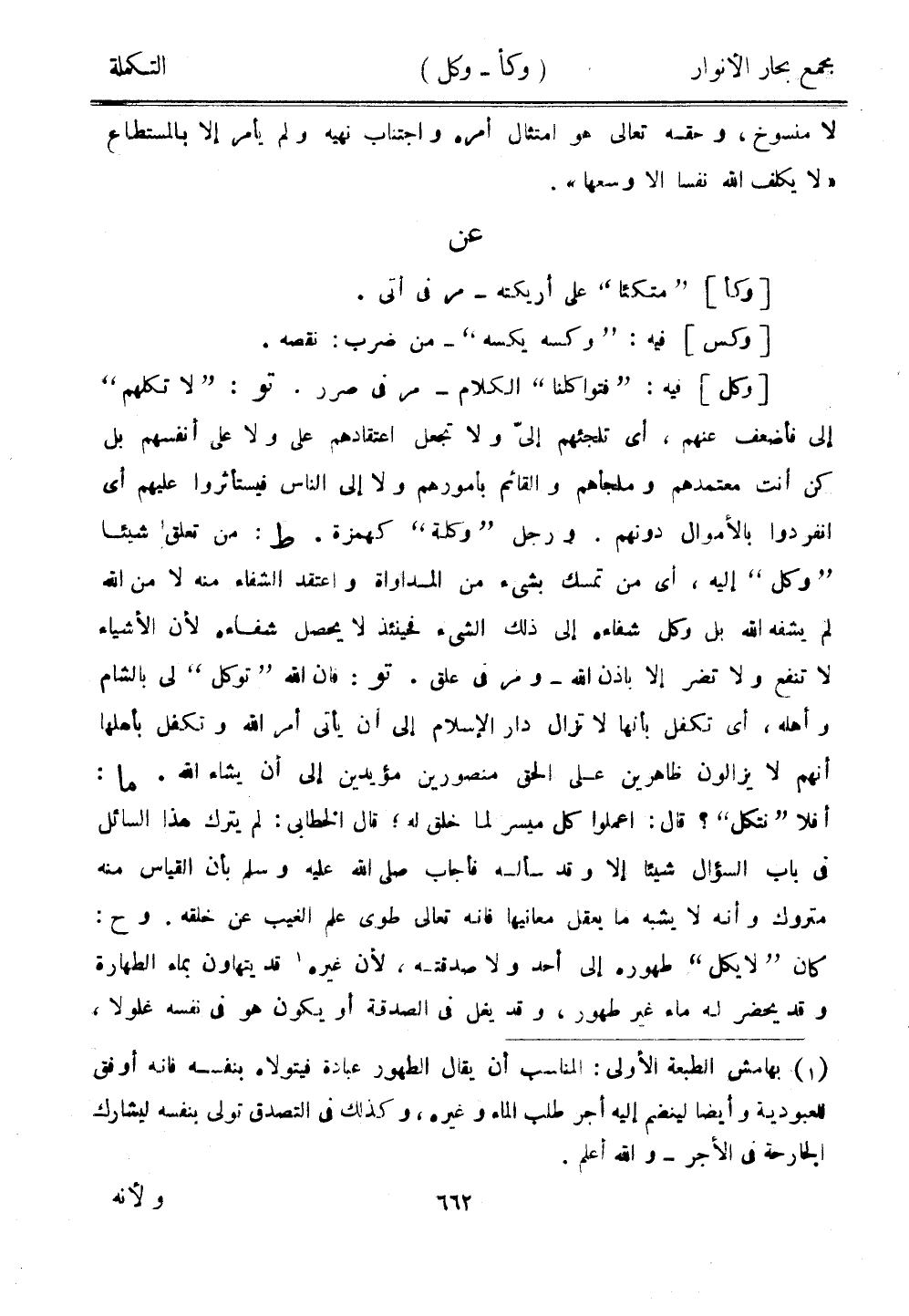 [وكل] فيه: "فتواكلنا" الكلام - مر في صرر. تو: "لا تكلهم" إلى فأضعف عنهم، أي تلجئهم إليّ ولاتجعل اعتقادهم على ولا على أنفسهم بل كن أنت معتمدهم وملجأهم والقائم بأمورهم ولا إلى الناس فيستأثروا عليهم أي انفردوا بالأموال دونهم. ورجل "وكلة" كهمزة. ط: من تعلق شيئًا "وكل" إليه، أي من تمسك بشيء من المداواة واعتقد الشفاء منه لا من الله لم يشفه الله بل وكل شفاءه إلى ذلك الشيء فحينئذ لا يحصل شفاءه لأن الأشياء لا تنفع ولا تضر إلا بإذن الله - ومر في علق. تو: فإن الله "توكل" لي بالشام وأهله، أي تكفل بأنها لا تزال دار الإسلام إلى أن يأتي أمر الله وتكفل بأهلها أنهم لا يزالون ظاهرين على الحق منصورين مؤيدين إلى أن يشاء الله. ما: أفلا "نتكل"؟ قال: اعملوا كل ميسر لما خلق له، قال الخطابي: لم يترك هذا السائل في باب السؤال شيئًا غلا وقد سأله فأجاب صلى الله عليه وسلم بأن القياس منه متروك وأنه لا يشبه ما يعقل معانيها فإنه تعالى طوى علم الغيب عن خلقه. وح: كان "لا يكل" طهوره إلى أحد ولا صدقته، لأن غيره قد يتهاون بماء الطهارة وقد يحضر له ماء غير طهور، وقد يغل في الصدقة أو يكون هو في نفسه غلولا،