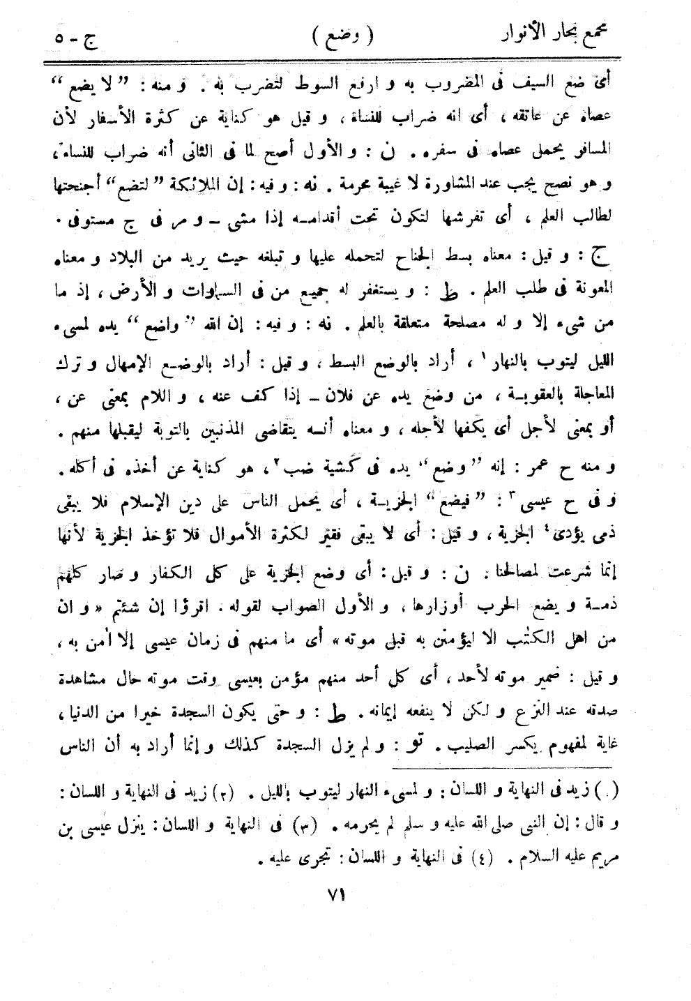 أي ضع السيف في المضور به وارفع السوط لتضرب به. ومنه: "لا يضع" عصاه عن عاتقه، أي أنه ضراب للنساء، وقيل هو كناية عن كثرة الأسفار لأن المسافر يحمل عصاه في سفره. ن: والأول أصح لما في الثاني أنه ضراب للنساء، وهو نصح يجب عند المشاورة لا غيبة محرمة. نه: وفيه: إن الملائكة "لتضع" أجنحتها لطالب العلم، أي تفرشها لتكون تحت أقدامه إذا مشى - ومر في ج مستوفى. ج: وقيل: معناه بسط الجناح لتحمله عليها وتبلغه حيث يريد من البلاد ومعناه المعونة في طلب العلم. ط: ويستغفر له جميع من في السماوات والأرض، إذ ما من شيء إلا وله مصلحة متعلقة بالعلم. نه: وفيه: إن الله "واضع" يده لمسيء الليل ليتوب بالنهار، أراد بالوضع البسط، وقيل: أراد بالوضع الإمهال وترك المعاجلة بالعقوبة، من وضع يده عن فلان - إذا كف عنه، واللام بمعنى عن، أو بمعنى لأجل أي يكفها لأجله، ومعناه أنه يتقاضى المذنبين بالتوبة ليقبلها منهم. ومنه ح عمر: إنه "وضع" يده في كشية ضب، هو كناية عن أخذه في أكله. وفي ح عيسى: "فيضع" الجزية، أي يحمل الناس على دين الإسلام فلا يبقى ذمي يؤدي الجزية، وقيل: أي لا يبقى فقير لكثرة الأموال فلا تؤخذ الجزية لأنها إنما شرعت لمصالحنا. ن: وقيل: أي وضع الجزية على كل الكفار وصار كلهم ذمة ويضع الحرب أوزارها، والأول الصواب لقوله. اقرؤوا عن شئتم "وأن من أهل الكتاب إلا ليؤمنن به قبل موته" أي ما منهم في زمان عيسى إلا أمن به، وقيل: ضمير موته لأحد، أي كل أحد منهم مؤمن بعيسى وقت موته حال مشاهدة صدقه عند النزع ولكن لا ينفعه إيمانه. ط: وحتى يكون السجدة خيرًا من الدنيا، غاية لمفهوم يكسر الصليب. تو: ولم يزل السجدة كذلك وإنما أراد به أن الناس