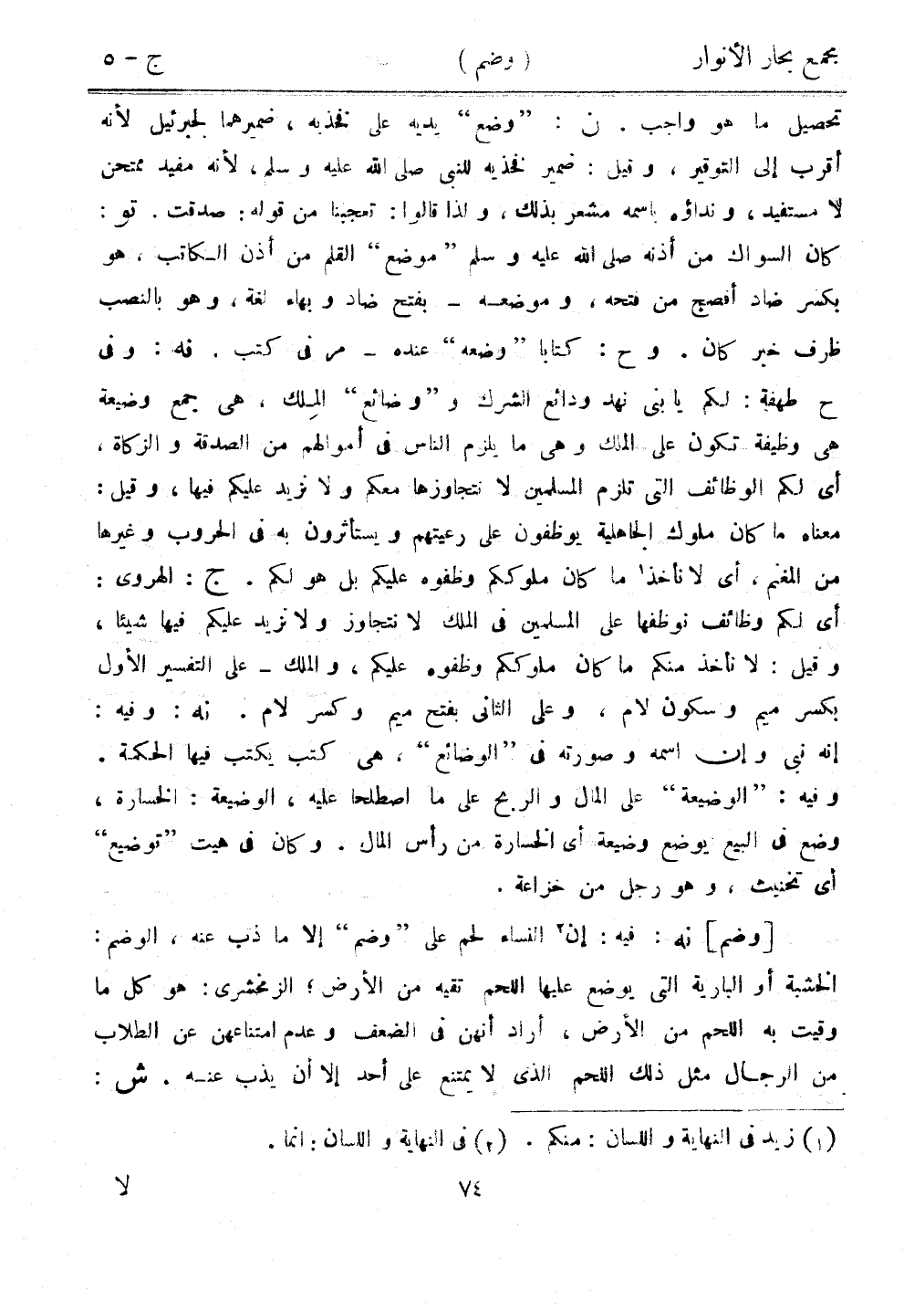 تحصيل ما هو واجب. ن: "وضع" يديه على فخذيه، ضميرهما لجبرئيل لأنه أقرب إلى التوقير، وقيل: ضمير فخذيه للنبي صلى الله عليه وسلم، لأنه مفيد ممتحن لا مستفيد، ونداؤه باسمه مشعر بذلك، ولذا قالوا: تعجبنا من قوله: صدقت. تو: كان السواك من أذنه صلى الله عليه وسلم "موضع" القلم من أذن الكاتب، هو بكسر ضاد أفصح من فتحه، وموضعه - بفتح ضاد وبهاء لغة، وهو بالنصب ظرف خبر كان. وح: كتابًا "وضعه" عنده - مر في كتب. نه: وفي ح طهفة: لكم يا بني نهد ودائع الشرك و"وضائع" الملك، هي جمع وضيعة هي وظيفة تكون على الملك وهي ما يلزم الناس في أموالهم من الصدقة والزكاة، أي لكم الوظائف التي تلزم المسلمين لا نتجاوزها معكم ولا نزيد عليكم فيها، وقيل: معناه ما كان ملوك الجاهلية يوظفون على رعيتهم ويستأثرون به في الحروب وغيرها من المغنم، أي لا نأخذ ما كان ملوككم وظفوه عليكم بل هو لكم. ج: الهروي: أي لكم وظائف نوظفها على المسلمين في الملك لا نتجاوز ولا تزيد عليكم فيها شيئًا، وقيل: لا نأخذ منكم ما كان ملوككم وظفوه عليكم، والملك - على التفسير الأول بكسر ميم وسكون لام، وعلى الثاني بفتح ميم وكسر لام. نه: وفيه: إنه نبي وإن اسمه وصورته في "الوضائع"، هي كتب يكتب فيها الحكمة. وفيه: "الوضيعة" على المال والربح على ما اصطلحا عليه، الوضيعة: الخسارة، وضع في البيع يوضع وضيعة أي الخسارة من رأس المال. وكان في هيت "توضيع" أي تخنبث، وهو رجل من خزاعة.