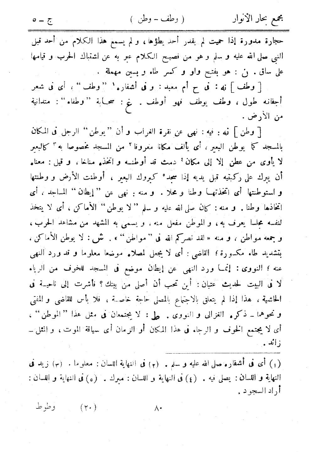 [وطن] نه: فيه: نهى عن نقرة الغراب وأن "يوطن" الرجل في المكان بالمسجد كما يوطن البعير، أي يألف مكانًا مغروفًا من المسجد مخصوصًا به كالبعير لا يأوي من عطن إلا إلى مكان دمث قد أوطنه واتخذه مناخًان وقيل: معناه أن يبرك على ركبتيه قبل يديه إذا سجد كبروك البعير، أوطنت الأرض ووطنتها واستوطنتها أي اتخذتها وطنًا ومحلًا. ومنه: نهى عن "إيطان" المساجد، أي اتخاذها وطنا. ومنه: كان صلى الله عليه وسلم "لا يوطن" الأماكن، أي لا يتخذ لنفسه مجلسًا يعرف به، والموطن مفعل منه، ويسمى به المشهد من مشاهد الحرب، وجمعه مواطن، ومنه "لقد نصركم الله في "مواطن"". ش: لا يوطن الأماكن، بتشديد طاء مكسورة، القاضي: أي لا يجعل لمصلاه موضعًا معلومًا وقد ورد النهي عنه؛ النووي: غنما ورد النهي عن إيطان موضع في المسجد للخوف من الرياء لا في البيت لحديث عتبان: أين تحب أن أصلي من بيتك؟ فأشرت إلى ناحية في الحاشية، هذا إذا لم يتعلق بالاجتماع بالمصلى حاجة خاصة، فلا بأس للقاضي والمفتي ونحوهما - ذكره الغزالي والنووي. ط: لا يجتمعان في مثل هذا "الموطن"، أي لا يجتمع الخوف والرجاء في هذا المكان أو الزمان أي سياقة الموت، والمثل - زائد.
