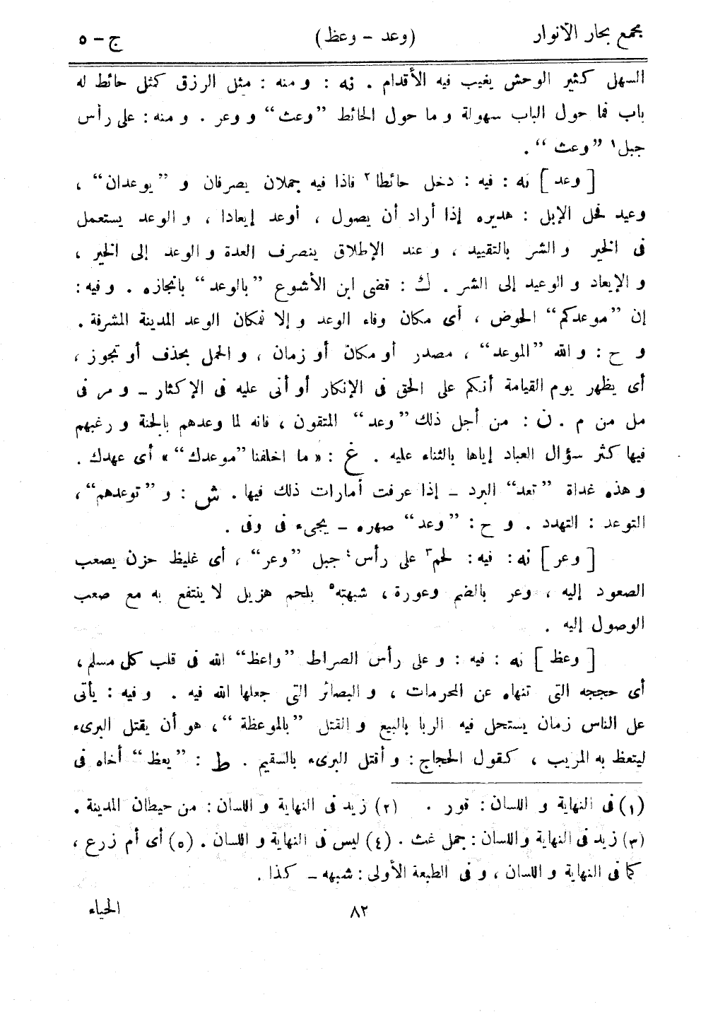 [وعد] نه: فيه: دخل حائطًا فإذا فيه جملان يصرفان و"يوعدان"، وعيد فحل الإبل: هديره إذا أراد أن يصول، أوعد إيعادًا، والوعد يستعمل في الخير والشر بالتقييد، وعند الإطلاق ينصرف العدة والوعد إلى الخير، والإيعاد والوعيد إلى الشر. ك: قضى ابن الأشوع "بالوعد" بإنجازه. وفيه: إن "موعدكم" الحوض، أي مكان وفاء الوعد وألا فمكان الوعد المدينة المشرفة. وح: والله "الموعد"، مصدر أو مكان أو زمان، والحمل بحذف أو تجوز، أي يظهر يوم القيامة أنكم على الحق في الإنكار أو أنى عليه في الإكثار - ومر في مل من م. ن: من أجل ذلك "وعد" المتقون، فإنه لما وعدهم بالجنة ورغبهم فيها كثر سؤال العباد إياها بالثناء عليه. غ: "ما أخلفنا "موعدك"" أي عهدك. وهذه غداة "تعد" البرد - إذا عرفت أمارات ذلك فيها. ش: و"توعدهم"، التوعد: التهدد. وح: "وعد" صهره - يجيء في وفى.