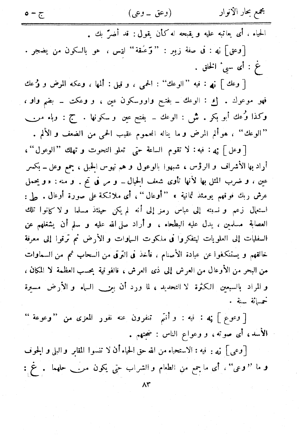 [وعل] نه: فيه: لا تقوم الساعة حتى تعلو التحوت وتهلك "الوعول"، أراد بها الأشراف والرؤس، شبهوا بالوعول وهم تيوس الجبل، جمع وعل - بكسر عين، وضرب المثل بها لأنها تأوى شعف الجبال - ومر في تح. ومنه: "ويحمل عرش ربك فوقهم يومئذ ثمانية" "أوعال"، أي ملائكة على صورة أوعال. ط: استعمال زعم ونسبته إلى عباس رمز إلى أنه لم يكن حينئذ مسلمًا ولا كانوا تلك العصابة مسلمين، يدل عليه البطحاء، وأراد صلى الله عليه وسلم أن يشغلهم عن السفليات إلى العلويات ليتفكروا في ملكوت السماوات والأرض ثم ترقوا إلى معرفة خالقهم ويستنكفوا عن عبادة الأصنام، فأخذ في الترقي من السحاب ثم من السماوات من البحر من الأوعال من العرش إلى ذي العرش، فالفوقية بحسب العظمة لا المكان، والمراد بالسبعين الكثرة لا التحديد، لما ورد أن بين السماء والأرض مسيرة خمسمائة سنة.