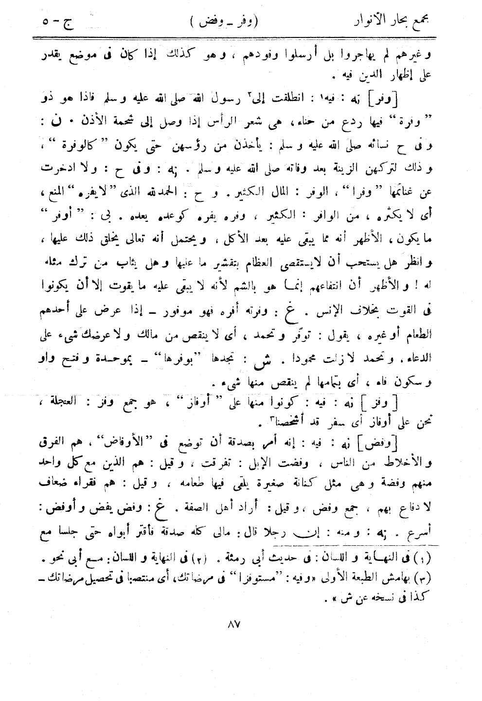 [وفر] نه: فيه: انطلقت إلى رسول الله صلى الله عليه وسلم فإذا هو ذو "وفرة" فيها ردع من حناء، هي شعر الرأس إذا وصل إلى شحمة الأذن. ن: وفي ح نسائه صلى الله عليه وسلم: يأخذن من رؤسهن حتى يكون "كالوفرة"، وذلك لتركهن الزينة بعد وفاته صلى الله عليه وسلم. نه: وفي ح: ولا ادخرت عن غنائمها "وفرا"، الوفر: المال الكثير. وح: الحمد لله الذي "لا يفره" المنع، أي لا يكثرهن من الوافر: الكثير، وفره يفره كوعده يعده. بي: "أوفر" ما يكون، الأظهر أنه مما يبقى عليه بعد الأكل، ويحتمل أنه تعالى يخلق ذلك عليها، وانظر هل يستحب أن لا يستقصي العظام بتقشير ما عليها وهل يثاب من ترك مثله له! والأظهر أن انتفاعهم إنما هو بالشم لأنه لا يبقى عليه ما يقوت إلا أن يكونوا في القوت بخلاف الإنس. غ: وفرته أفره فهو موفور - إذا عرض على احدهم الطعام أو غيره، يقول: توفر وتحمد، أي لا ينقص من مالك ولا عرضك شيء على الدعاء. وتحمد لا زلت محمودًا. ش: تجدها "بوفرها" - بموحدة وفتح واو وسكون فاء، أي بتمامها لم ينقص منها شيء.