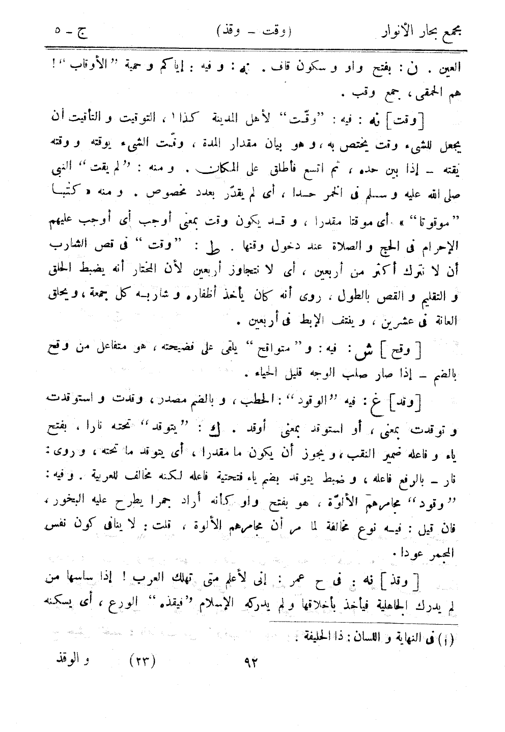 [وقت] نه: فيه: "وقت" لأهل المدينة كذا، التوقيت التأقيت أن يجعل للشيء وقت يختص به، وهو بيان مقدار المدة، وقت الشيء يوقت ووقته يقته - إذا بين حده، ثم اتسع فأطلق على المكان. ومنه: "لم يقت" النبي صلى الله عليه وسلم في الخمر حدًا، أي لم يقدر بعدد مخصوص. ومنه "كتبًا "موقوتًا"" أي موقتًا مقدرًا، وقد يكون وقت بمعنى أوجب أي أوجب عليهم الإحرام في الحج والصلاة عند دخول وقتها. ط: "وقت" في قص الشارب أن لا نترك أكثر من أربعين، أي لا نتجاوز أربعين لن المختار أنه يضبط الحلق والتقليم والقص بالطول، روى أنه كان يأخذ أظفاره وشاربه كل جمعة، ويحلق العانة في عشرين، وينتف الإبط في أربعين.