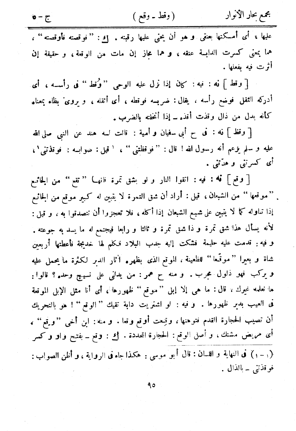 [وقط] نه: فيه: كان إذا نزل عليه الوحي "وُقط" في رأسه، أي أدركه الثقل فوضع رأسه، يقال: ضربه فوقطه، أي أثقله، ويروى بظاء بمعناه أنه بدل من ذال وقذت أقذه - إذا أثخنته بالضرب.