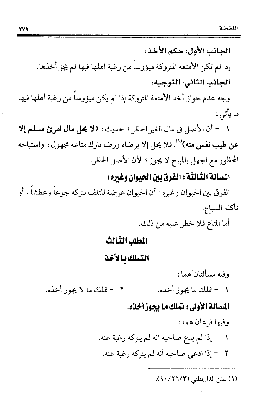 1 - أن الأصل في مال الغير الحظر؛ لحديث: (لا يحل مال امرئ مسلم إلا عن طيب نفس منه) (¬1). فلا يحل إلا برضاه ورضا تارك متاعه مجهول، واستباحة المحظور مع الجهل بالمبيح لا يجوز؛ لأن الأصل الحظر.