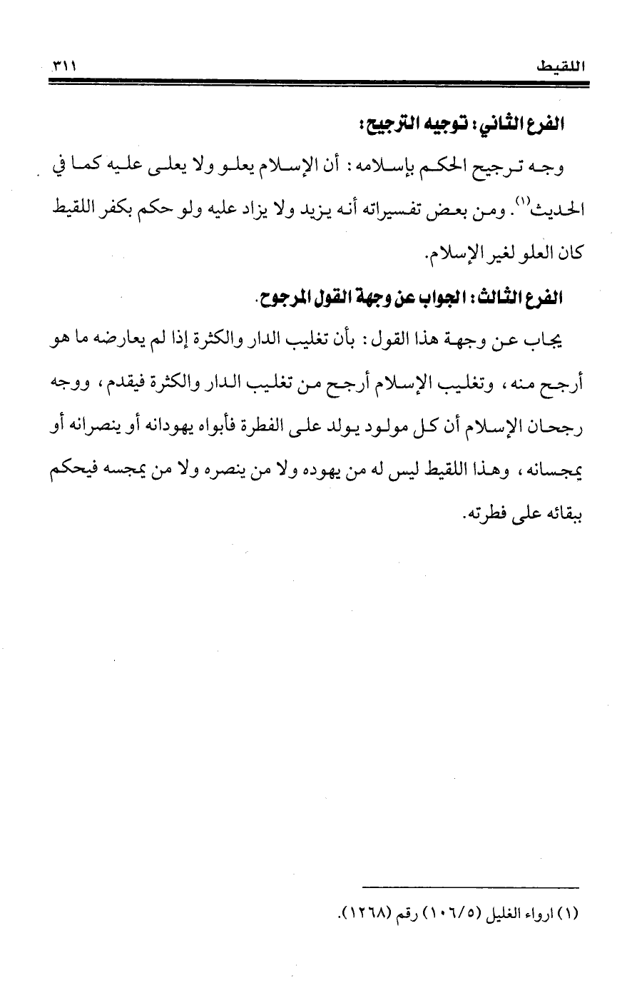 يجاب عن وجهة هذا القول: بأن تغليب الدار والكثرة إذا لم يعارضه ما هو أرجح منه، وتغليب الإسلام أرجح من تغليب الدار والكثرة فيقدم، ووجه رجحان الإسلام أن كل مولود يولد على الفطرة فأبواه يهودانه أو ينصرانه أو يمجسانه، وهذا اللقيط ليمس له من يهوده ولا من ينصره ولا من يمجسه فيحكم ببقائه على فطرته.