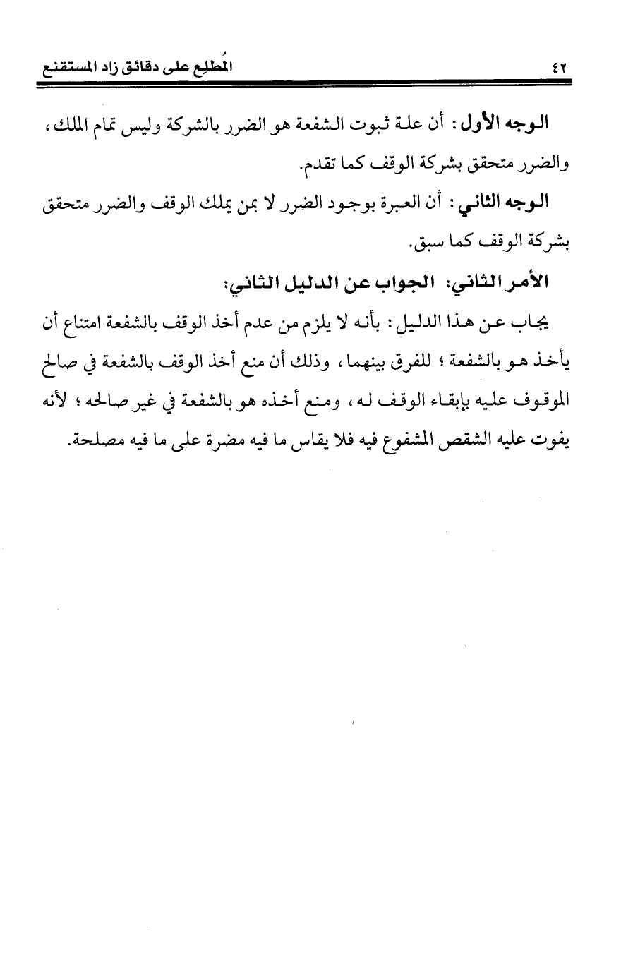 الوجه الأول: أن علة ثبوت الشفعة هو الضرر بالشركة وليس تمام الملك، والضرر متحقق بشركة الوقف كما تقدم.