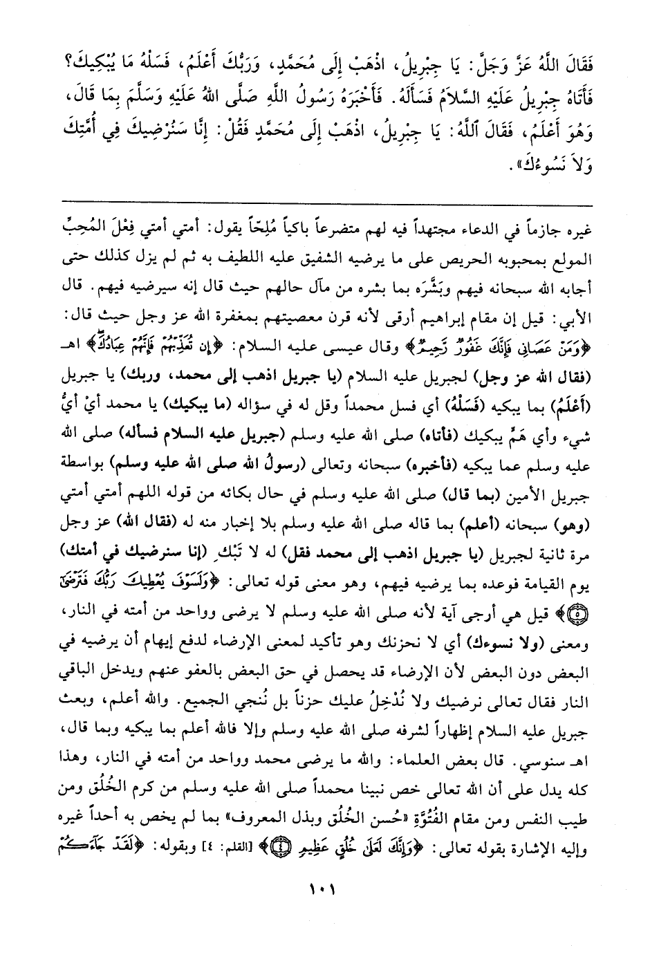فَقَال الله عَز وَجَل: يَا جِبْرِيلُ، اذْهَبْ إِلَى مُحَمدٍ، وَرَبكَ أَعْلَمُ، فَسَلْهُ مَا يُبْكِيكَ؟ فَأَتَاهُ جِبْرِيلُ عَلَيهِ السلامُ فَسَأَلَهُ. فَأخْبَرَهُ رَسُولُ الله صلى اللهُ عَلَيهِ وَسَلمَ بِمَا قَال، وَهُوَ أَعْلَمُ، فَقَال الله: يَا جِبْرِيلُ، اذْهَبْ إِلَى مُحَمدِ فَقُلْ: إِنا سَنُرْضِيكَ فِي أُمتِكَ وَلَا نَسُوءُكَ"