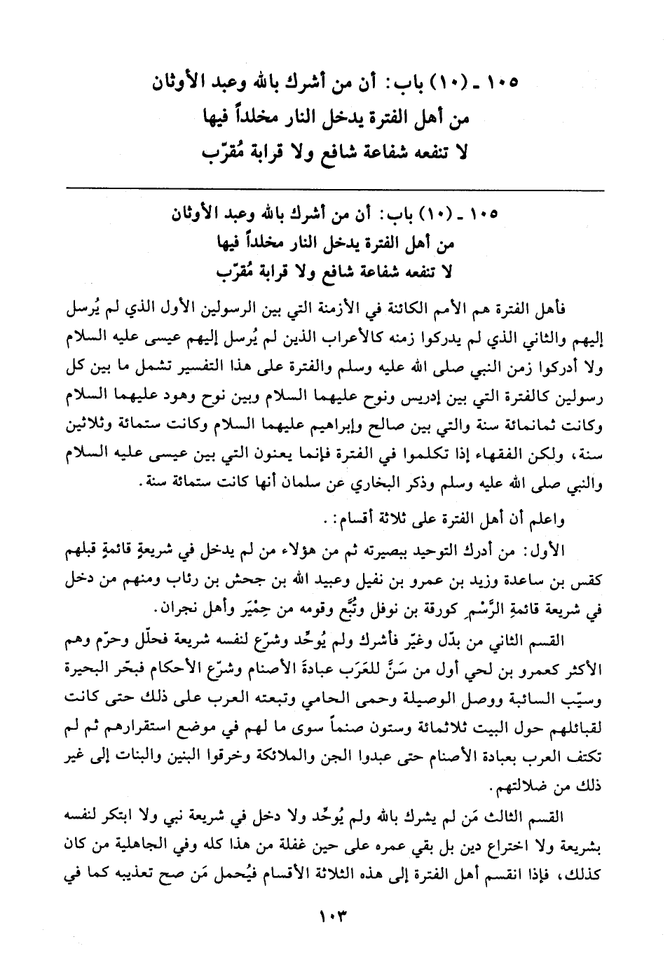 القسم الثالث مَن لم يشرك بالله ولم يُوحد ولا دخل في شريعة نبي ولا ابتكر لنفسه بشريعة ولا اختراع دين بل بقي عمره على حين غفلة من هذا كله وفي الجاهلية من كان كذلك، فإذا انقسم أهل الفترة إلى هذه الثلاثة الأقسام فيُحمل مَن صح تعذيبه كما في