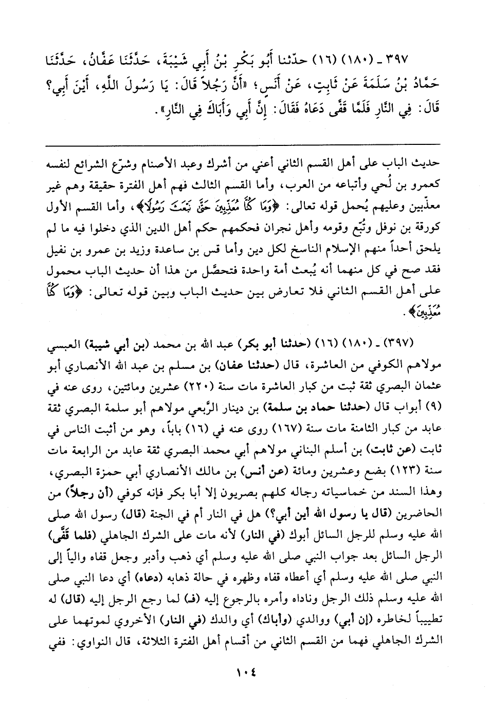 (٣٩٧) - (١٨٠) (١٦) (حدثنا أبو بكر) عبد الله بن محمد (بن أبي شيبة) العبسي مولاهم الكوفي من العاشرة، قال (حدثنا عفان) بن مسلم بن عبد الله الأنصاري أبو عثمان البصري ثقة ثبت من كبار العاشرة مات سنة (٢٢٠) عشرين ومائتين، روى عنه في (٩) أبواب قال (حدثنا حماد بن سلمة) بن دينار الزبعي مولاهم أبو سلمة البصري ثقة عابد من كبار الثامنة مات سنة (١٦٧) روى عنه في (١٦) بابا، وهو من أثبت الناس في ثابت (عن ثابت) بن أسلم البناني مولاهم أبي محمد البصري ثقة عابد من الرابعة مات سنة (١٢٣) بضع وعشرين ومائة (عن أنس) بن مالك الأنصاري أبي حمزة البصري، وهذا السند من خماسياته رجاله كلهم بصريون إلا أبا بكر فإنه كوفي (أن رجلًا) من الحاضرين (قال يا رسول الله أين أبي؟ ) هل في النار أم في الجنة (قال) رسول الله صلى الله عليه وسلم للرجل السائل أبوك (في النار) لأنه مات على الشرك الجاهلي (فلما قَفَّى) الرجل السائل بعد جواب النبي صلى الله عليه وسلم أي ذهب وأدبر وجعل قفاه واليًا إلى النبي صلى الله عليه وسلم أي أعطاه قفاه وظهره في حالة ذهابه (دعاه) أي دعا النبي صلى الله عليه وسلم ذلك الرجل وناداه وأمره بالرجوع إليه (فـ) لما رجع الرجل إليه (قال) له تطييبًا لخاطره (إن أبي) ووالدي (وأباك) أي والدك (في النار) الأخروي لموتهما على الشرك الجاهلي فهما من القسم الثاني من أقسام أهل الفترة الثلاثة، قال النواوي: ففي