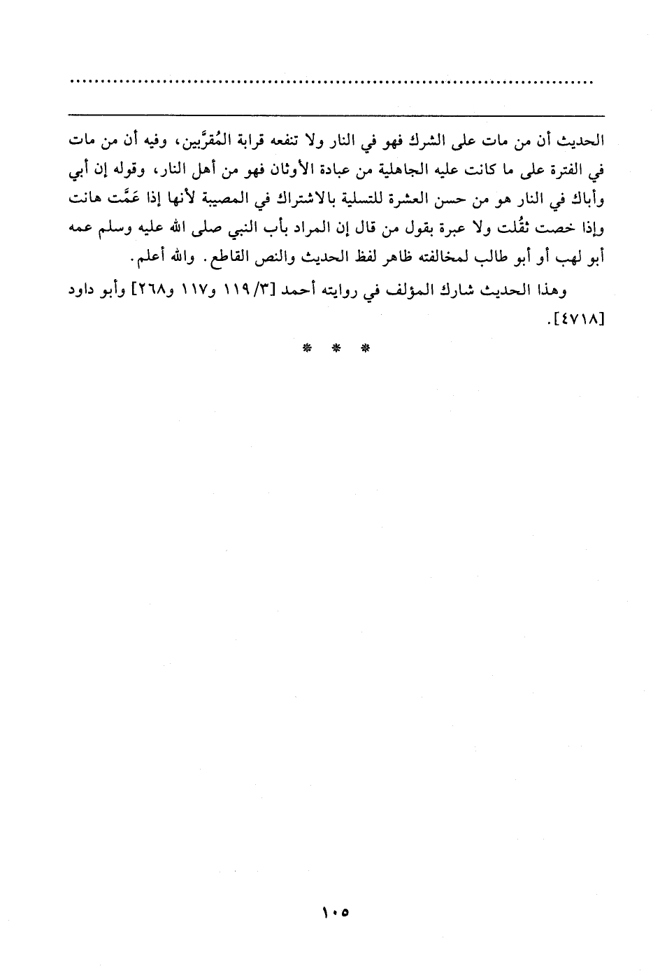 الحديث أن من مات على الشرك فهو في النار ولا تنفعه قرابة المُقربين، وفيه أن من مات في الفترة على ما كانت عليه الجاهلية من عبادة الأوثان فهو من أهل النار، وقوله إن أبي وأباك في النار هو من حسن العشرة للتسلية بالاشتراك في المصيبة لأنها إذا عَمَّت هانت وإذا خصت ثقُلت ولا عبرة بقول من قال إن المراد باب النبي صلى الله عليه وسلم عمه أبو لهب أو أبو طالب لمخالفته ظاهر لفظ الحديث والنص القاطع. والله أعلم.