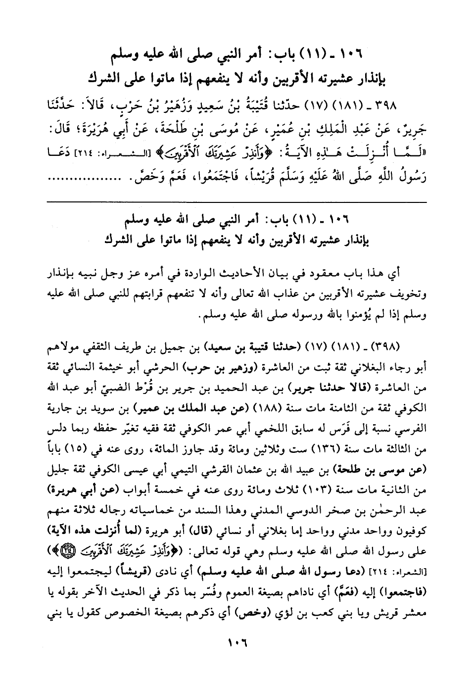 ١٠٦ - (١١) باب: أمر النبي صلى الله عليه وسلم بإنذار عشيرته الأقربين وأنه لا ينفعهم إذا ماتوا على الشرك