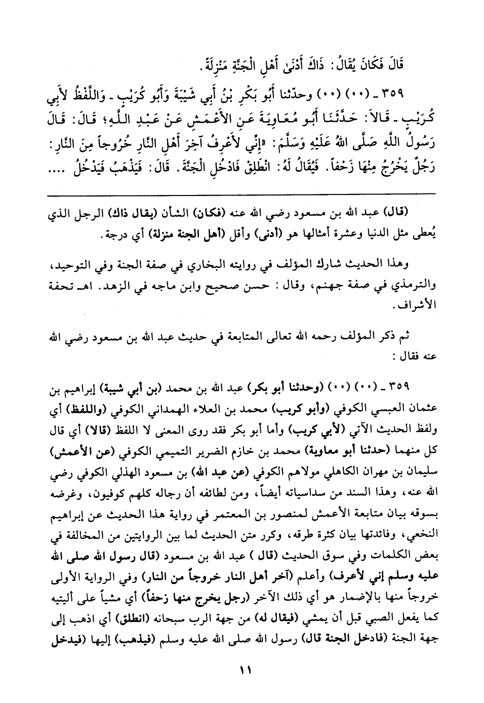 ٣٥٩ - (٠٠) (٠٠) وحدَّثنا أَبُو بَكرِ بْنُ أبِي شَيبَةَ وَأَبُو كُرَيبٍ -وَاللَّفْظُ لأَبِي كُرَيبٍ- قَالا: حَدَّثَنَا أَبُو مُعَاويةَ عَنِ الأَعْمَشِ عَن عَبْدِ اللهِ؛ قَال: قَال رَسُولُ اللهِ صَلَّى اللهُ عَلَيهِ وَسَلَّمَ: "إِني لأَعْرِفُ آخِرَ أَهْلِ النَّارِ خُرُوجًا مِنَ النَّارِ: رَجُلٌ يَخْرُجُ مِنْهَا زَحْفًا. فَيُقَالُ لَهُ: انطَلِق فَادْخُلِ الْجَنَّةَ. قَال: فَيَذهَبُ فَيَدْخُلُ