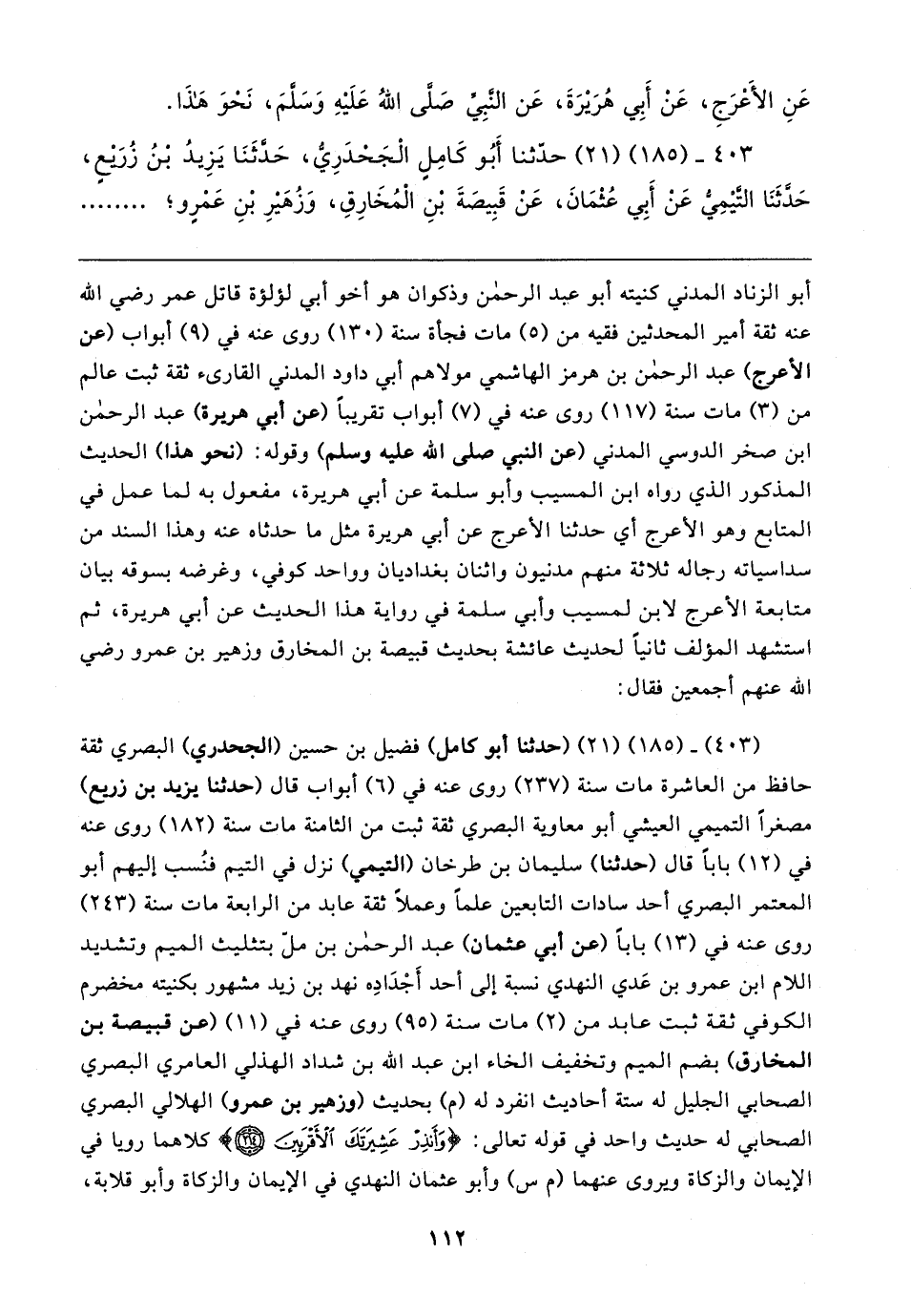 (٤٠٣) - (١٨٥) (٢١) (حدثنا أبو كامل) فضيل بن حسين (الجحدري) البصري ثقة حافظ من العاشرة مات سنة (٢٣٧) روى عنه في (٦) أبواب قال (حدثنا يزيد بن زريع) مصغرًا التميمي العيشي أبو معاوية البصري ثقة ثبت من الثامنة مات سنة (١٨٢) روى عنه في (١٢) بابا قال (حدثنا) سليمان بن طرخان (التيمي) نزل في التيم فنُسب إليهم أبو المعتمر البصري أحد سادات التابعين علمًا وعملا ثقة عابد من الرابعة مات سنة (٢٤٣) روى عنه في (١٣) بابا (عن أبي عثمان) عبد الرحمن بن مل بتثليث الميم وتشديد اللام ابن عمرو بن عَدي النهدي نسبة إلى أحد أَجْدَادِه نهد بن زيد مشهور بكنيته مخضرم الكوفي ثقة ثبت عابد من (٢) مات سنة (٩٥) روى عنه في (١١) (عن قبيصة بن المخارق) بضم الميم وتخفيف الخاء ابن عبد الله بن شداد الهذلي العامري البصري الصحابي الجليل له ستة أحاديث انفرد له (م) بحديث (وزهير بن عمرو) الهلالي البصري الصحابي له حديث واحد في قوله تعالى {وَأَنْذِرْ عَشِيرَتَكَ الْأَقْرَبِينَ (٢١٤)} كلاهما رويا في الإيمان والزكاة ويروى عنهما (م س) وأبو عثمان النهدي في الإيمان والزكاة وأبو قلابة،