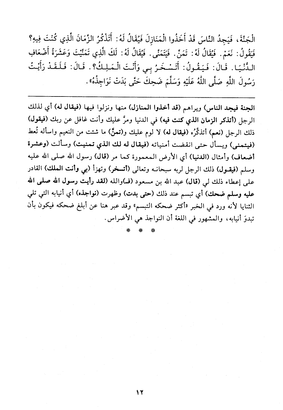 الْجَنَّةَ، فَيَجِدُ النَّاسَ قَدْ أَخَذُوا الْمَنَازِلَ فَيُقَالُ لَهُ: أَتَذْكُرُ الزَّمَانَ الذِي كُنْتَ فِيهِ؟ فَيَقُولُ: نَعَمْ. فَيُقَالُ لَهُ: تَمَنَّ. فَيَتَمَنَّى. فَيُقَالُ لَهُ: لَكَ الذِي تَمَنَّيتَ وَعَشَرَةُ أَضْعَافِ الدُّنْيَا. قَال: فَيَقُولُ: أَتَسْخَرُ بِي وَأَنْتَ المَلِكُ؟ . قَال: فَلَقَدْ رَأَيتُ رَسُولَ اللهِ صَلَّى اللهُ عَلَيهِ وَسَلَّمَ ضَحِكَ حَتَّى بَدَتْ نَوَاجِذُهُ"