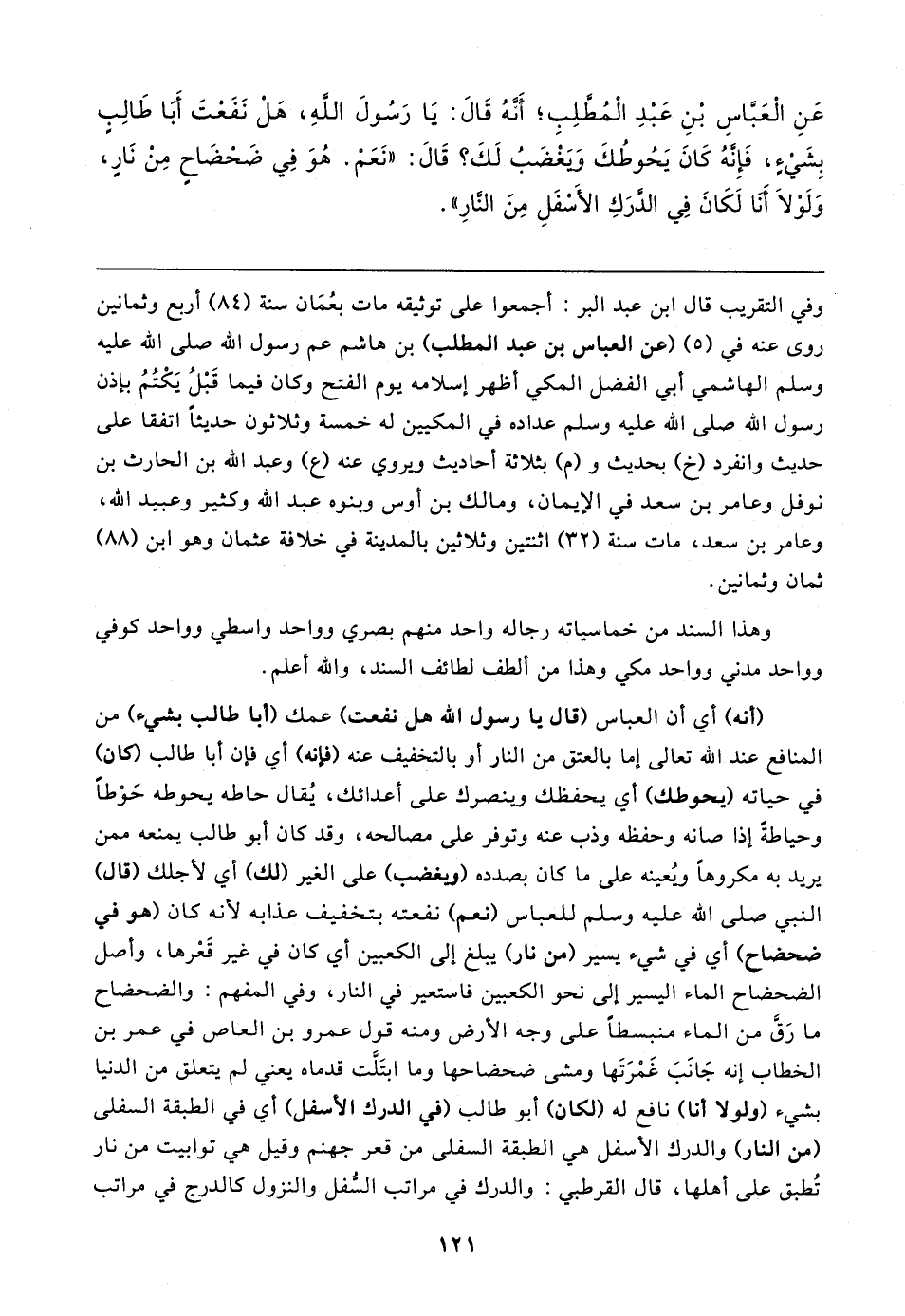 عَنِ الْعَباسِ بْنِ عَبْدِ الْمُطلِبِ؛ أَنهُ قَال: يَا رَسُولَ الله، هَلْ نَفَعتَ أبَا طَالِبٍ بِشَيءٍ، فَإِنهُ كَانَ يَحُوطُكَ ويغْضَبُ لَكَ؟ قَال: "نَعَمْ. هُوَ فِي ضَحْضَاح مِنْ نَارٍ، وَلَوْلا أَنَا لَكَانَ فِي الدرَكِ الأَسفَلِ مِنَ النارِ"
