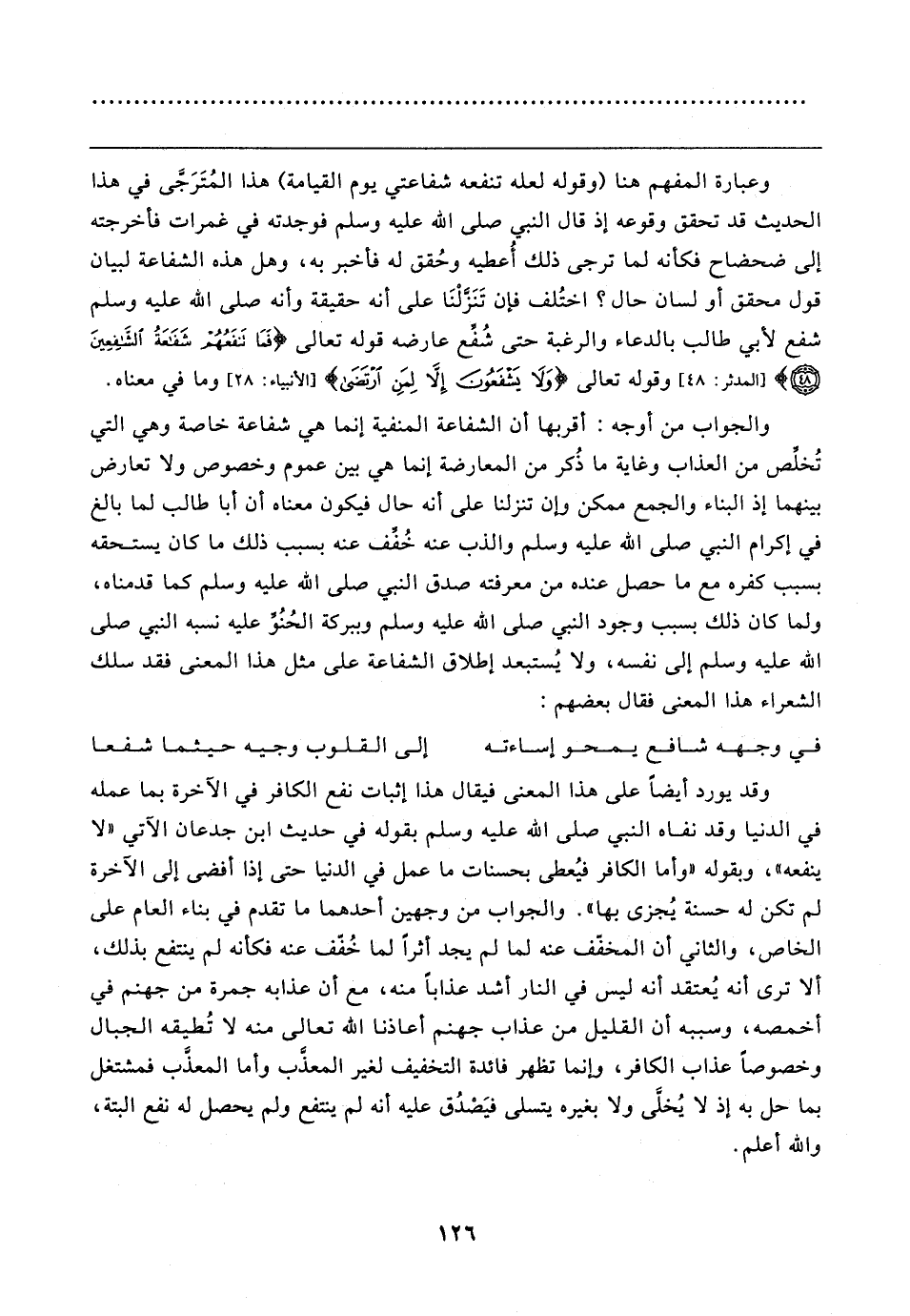 والجواب من أوجه: أقربها أن الشفاعة المنفية إنما هي شفاعة خاصة وهي التي تُخفص من العذاب وغاية ما ذُكر من المعارضة إنما هي بين عموم وخصوص ولا تعارض بينهما إذ البناء والجمع ممكن وإن تنزلنا على أنه حال فيكون معناه أن أبا طالب لما بالغ في إكرام النبي صلى الله عليه وسلم والذب عنه خُفف عنه بسبب ذلك ما كان يستحقه بسبب كفره مع ما حصل عنده من معرفته صدق النبي صلى الله عليه وسلم كما قدمناه، ولما كان ذلك بسبب وجود النبي صلى الله عليه وسلم وببركة الحُنُو عليه نسبه النبي صلى الله عليه وسلم إلى نفسه، ولا يُستبعد إطلاق الشفاعة على مثل هذا المعنى فقد سلك الشعراء هذا المعنى فقال بعضهم: