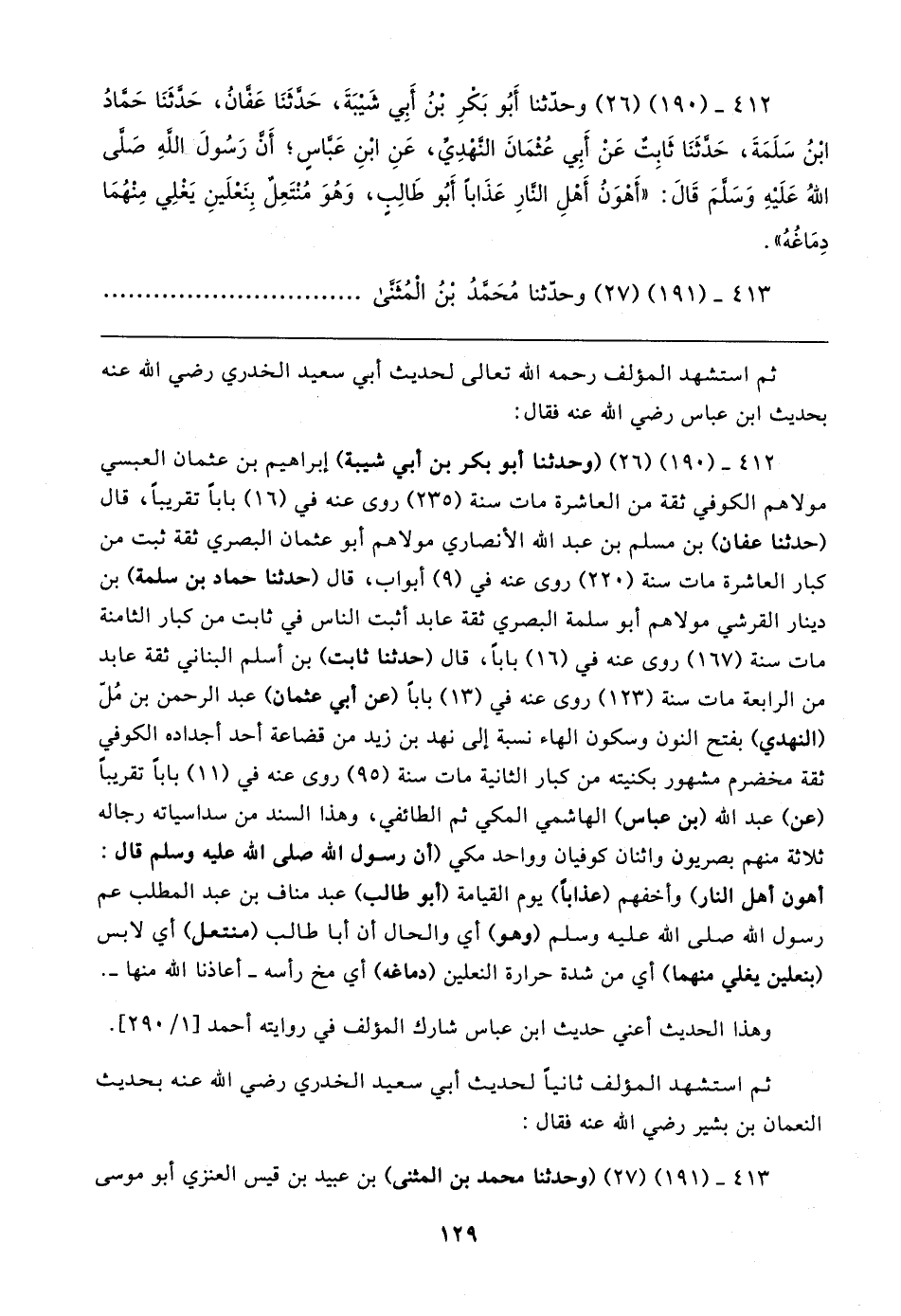 ٤١٢ - (١٩٠) (٢٦) وحدثنا أَبُو بَكرِ بن أَبِي شَيبَةَ، حَدَّثَنَا عَفانُ، حَدَّثَنَا حَمادُ بْنُ سَلَمَةَ، حَدَّثَنَا ثَابِتٌ عَنْ أَبِي عُثْمَانَ النهدِي، عَنِ ابْنِ عَباس؛ أَن رَسُولَ الله صلى اللهُ عَلَيهِ وَسَلمَ قَال: "أَهْوَنُ أَهْلِ النارِ عَذَابًا أَبُو طَالِبٍ، وَهُوَ مُنْتَعِلْ بِنَغلَينِ يَغْلِي مِنْهُمَا دِمَاغُهُ".