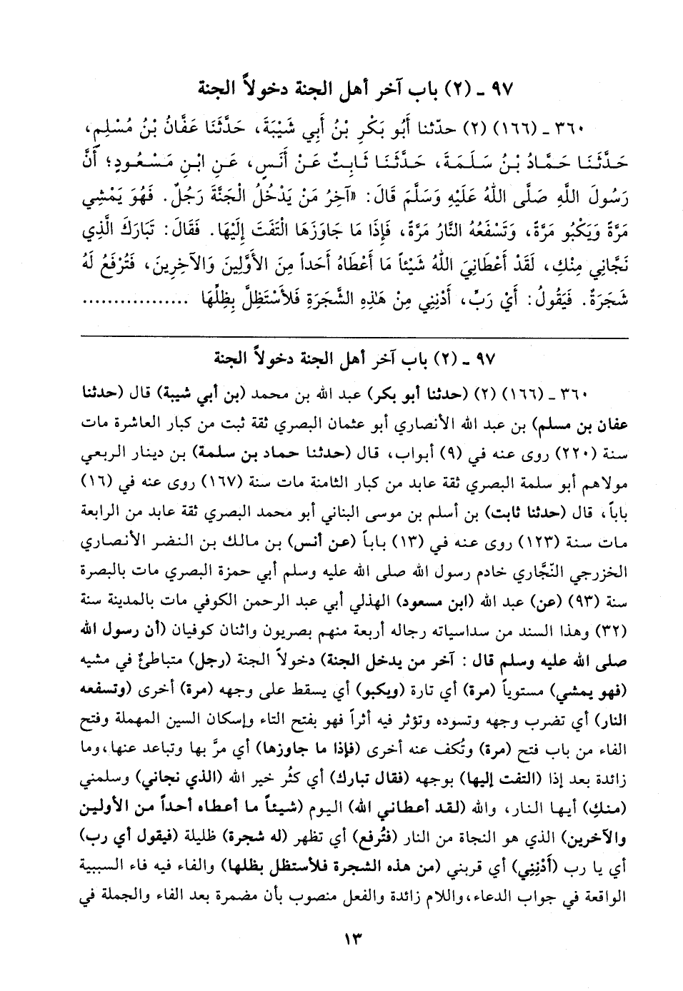 ٣٦٠ - (١٦٦) (٢) (حدثنا أبو بكر) عبد الله بن محمد (بن أبي شيبة) قال (حدثنا عفان بن مسلم) بن عبد الله الأنصاري أبو عثمان البصري ثقة ثبت من كبار العاشرة مات سنة (٢٢٠) روى عنه في (٩) أواب، قال (حدثنا حماد بن سلمة) بن دينار الربعي مولاهم أبو سلمة البصري ثقة عابد من كبار الثامنة مات سنة (١٦٧) روى عنه في (١٦) بابا، قال (حدثنا ثابت) بن أسلم بن موسى البناني أبو محمد البصري ثقة عابد من الرابعة مات سنة (١٢٣) روى عنه في (١٣) بابا (عن أنس) بن مالك بن النضر الأنصاري الخزرجي النجَّاري خادم رسول الله صلى الله عليه وسلم أبي حمزة البصري مات بالبصرة سنة (٩٣) (عن) عبد الله (ابن مسعود) الهذلي أبي عبد الرحمن الكوفي مات بالمدينة سنة (٣٢) وهذا السند من سداسياته رجاله أربعة منهم بصريون واثنان كوفيان (أن رسول الله صلى الله عليه وسلم قال: آخر من يدخل الجنة) دخولًا الجنة (رجل) متباطئٌ في مشيه (فهو يمشي) مستويًا (مرة) أي تارة (ويكبو) أي يسقط على وجهه (مرة) أخرى (وتسفعه النار) أي تضرب وجهه وتسوده وتؤثر فيه أثرًا فهو بفتح التاء وإسكان السين المهملة وفتح الفاء من باب فتح (مرة) وتُكف عنه أخرى (فإذا ما جاوزها) أي مرَّ بها وتباعد عنها، وما زائدة بعد إذا (التفت إليها) بوجهه (فقال تبارك) أي كثُر خير الله (الذي نجاني) وسلمني (منكِ) أيها النار، والله (لقد أعطاني الله) اليوم (شيئًا ما أعطاه أحدًا من الأولين والآخرين) الذي هو النجاة من النار (فتُرفع) أي تظهر (له شجرة) ظليلة (فيقول أي رب) أي يا رب (أَدْنِنِي) أي قربني (من هذه الشجرة فلأستظل بظلها) والفاء فيه فاء السببية الواقعة في جواب الدعاء، واللام زائدة والفعل منصوب بأن مضمرة بعد الفاء والجملة في
