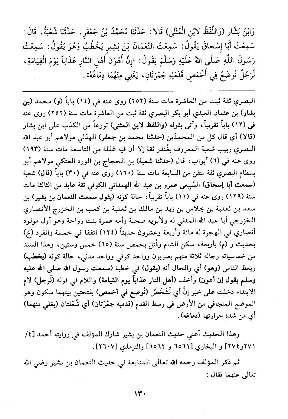 وَابنُ بَشَّار (وَاللفظُ لابنِ المُثَنَّى) قَالا: حَدثنا مُحَمدُ بن جَعفَرٍ. حَدَّثَنَا شُعبَةُ. قَال: سَمِعْتُ أَبَا إِسْحاقَ يَقُولُ: سَمِعْتُ النعْمَانَ بْنَ بَشِيرِ يَخطُبُ وَهُوَ يَقُولُ: سَمِعتُ رَسُولَ الله صَلى اللهُ عَلَيهِ وَسَلمَ يَقُولُ: "إِن أَهْوَنَ أَهلِ النارِ عَذَابا يَوْمَ الْقِيَامَةِ، لَرَجُلٌ تُوضَعُ فِي أَخْمَصِ قَدَمَيهِ جَمْرَتَانِ، يَغلِي مِنْهُمَا دِمَاغُهُ"
