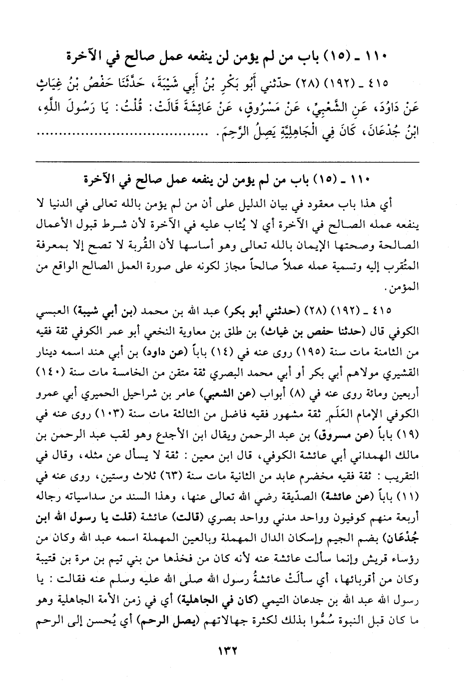 ٤١٥ - (١٩٢) (٢٨) حدّثني أَبُو بَكْرِ بْنُ أبِي شَيبَةَ، حَدَّثَنَا حَفْصُ بْنُ غِيَاثٍ عَنْ دَاوُدَ، عَنِ الشَّعْبِي، عَنْ مَسْرُوقٍ، عَنْ عَائِشَةَ قَالتْ: قُلْتُ: يَا رَسُولَ الله، ابْنُ جُدْعَانَ، كَانَ فِي الْجَاهِلِيةِ يَصِلُ الرَّحِمَ