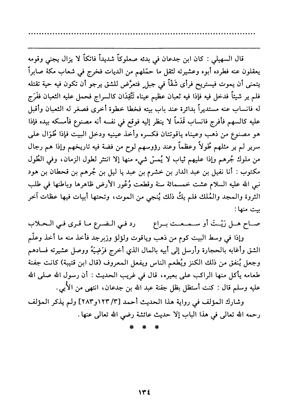 وإذا في وسط البيت كوم من ذهب وياقوت ولؤلؤ وزبرجد فأخذ منه ما أخذ وعلم الشق وأغابه بالحجارة وأرسل إلى أبيه بالمال الذي أخرج فرَضِيَهُ ووصل عشيرته فسادهم وجعل يُنفق من ذلك الكنز ويُطعم الناس ويفعل المعروف (قال ابن قتيبة) كانت جفنة طعامه يأكل منها الراكب على بعيره، قال في غريب الحديث: أن رسول الله صلى الله عليه وسلم قال: كنت أستظل بظل جفنة عبد الله بن جدعان، انتهى من الأبي.