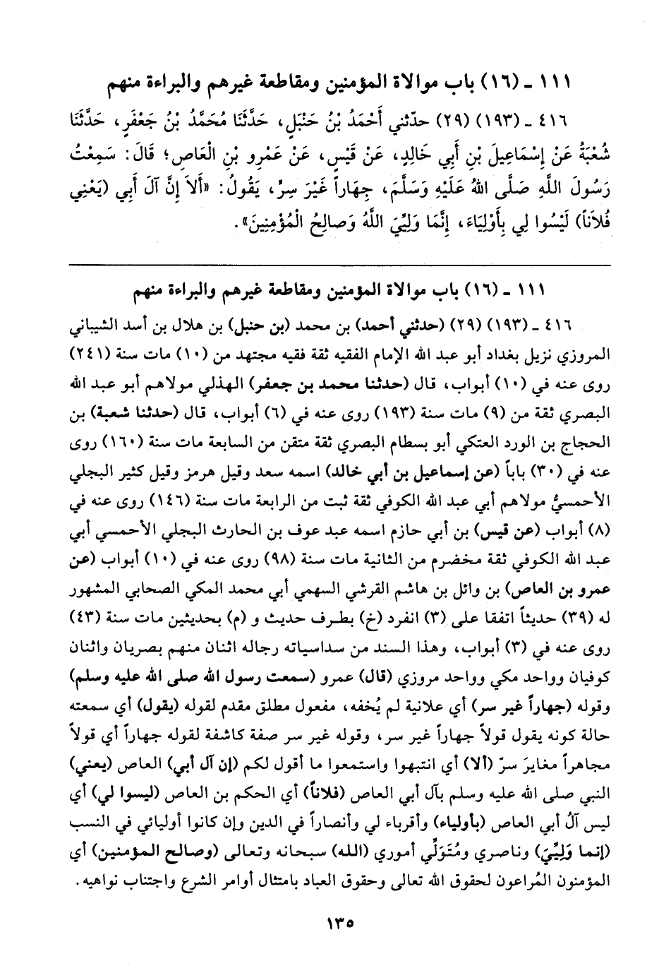 ٤١٦ - (١٩٣) (٢٩) (حدثني أحمد) بن محمد (بن حنبل) بن هلال بن أسد الشيباني المروزي نزيل بغداد أبو عبد الله الإمام الفقيه ثقة فقيه مجتهد من (١٠) مات سنة (٢٤١) روى عنه في (١٠) أبواب، قال (حدثنا محمد بن جعفر) الهذلي مولاهم أبو عبد الله البصري ثقة من (٩) مات سنة (١٩٣) روى عنه في (٦) أبواب، قال (حدثنا شعبة) بن الحجاج بن الورد العتكي أبو بسطام البصري ثقة متقن من السابعة مات سنة (١٦٠) روى عنه في (٣٠) بابًا (عن إسماعيل بن أبي خالد) اسمه سعد وقيل هرمز وقيل كثير البجلي الأحمسي مولاهم أبي عبد الله الكوفي ثقة ثبت من الرابعة مات سنة (١٤٦) روى عنه في (٨) أبواب (عن قيس) بن أبي حازم اسمه عبد عوف بن الحارث البجلي الأحمسي أبي عبد الله الكوفي ثقة مخضرم من الثانية مات سنة (٩٨) روى عنه في (١٠) أبواب (عن عمرو بن العاص) بن وائل بن هاشم القرشي السهمي أبي محمد المكي الصحابي المشهور له (٣٩) حديثًا اتفقا على (٣) انفرد (خ) بطرف حديث و (م) بحديثين مات سنة (٤٣) روى عنه في (٣) أبواب، وهذا السند من سداسياته رجاله اثنان منهم بصريان واثنان كوفيان وواحد مكي وواحد مروزي (قال) عمرو (سمعت رسول الله صلى الله عليه وسلم) وقوله (جهارًا غير سر) أي علانية لم يُخفه، مفعول مطلق مقدم لقوله (يقول) أي سمعته حالة كونه يقول قولًا جهارًا غير سر، وقوله غير سر صفة كاشفة لقوله جهارًا أي قولًا مجاهرًا مغايرَ سرّ (ألا) أي انتبهوا واستمعوا ما أقول لكم (أن آل أبي) العاص (يعني) النبي صلى الله عليه وسلم بآل أبي العاص (فلانًا) أي الحكم بن العاص (ليسوا لي) أي ليس آلُ أبي العاص (بأولياء) وأقرباء لي وأنصارًا في الدين وإن كانوا أوليائي في النسب (إنما وَليِّيَ) وناصري ومُتَوَلِّي أموري (الله) سبحانه وتعالى (وصالح المؤمنين) أي المؤمنون المُراعون لحقوق الله تعالى وحقوق العباد بامتثال أوامر الشرع واجتناب نواهيه.