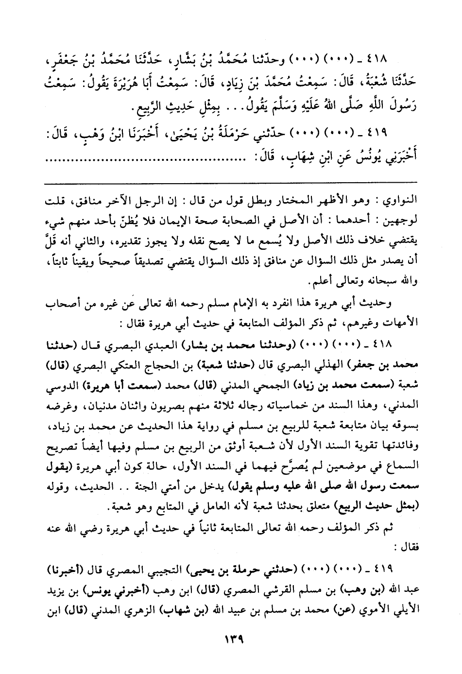 ٤١٨ - (٠٠) (٠٠) وحدثنا محمد بن بشار) العبدي البصري قال (حدثنا محمد بن جعفر) الهذلي البصري قال (حدثنا شعبة) بن الحجاج العتكي البصري (قال) شعبة (سمعت محمد بن زياد) الجمحي المدني (قال) محمد (سمعت أبا هريرة) الدوسي المدني، وهذا السند من خماسياته رجاله ثلاثة منهم بصريون واثنان مدنيان، وغرضه بسوقه بيان متابعة شعبة للربيع بن مسلم في رواية هذا الحديث عن محمد بن زياد، وفائدتها تقوية السند الأول لأن شعبة أوثق من الربيع بن مسلم وفيها أيضًا تصريح السماع في موضعين لم يُصرح فيهما في السند الأول، حالة كون أبي هريرة (يقول سمعت رسول الله صلى الله عليه وسلم يقول) يدخل من أمتي الجنة .. الحديث، وقوله (بمثل حديث الربيع) متعلق بحدثنا شعبة لأنه العامل في المتابع وهو شعبة.
