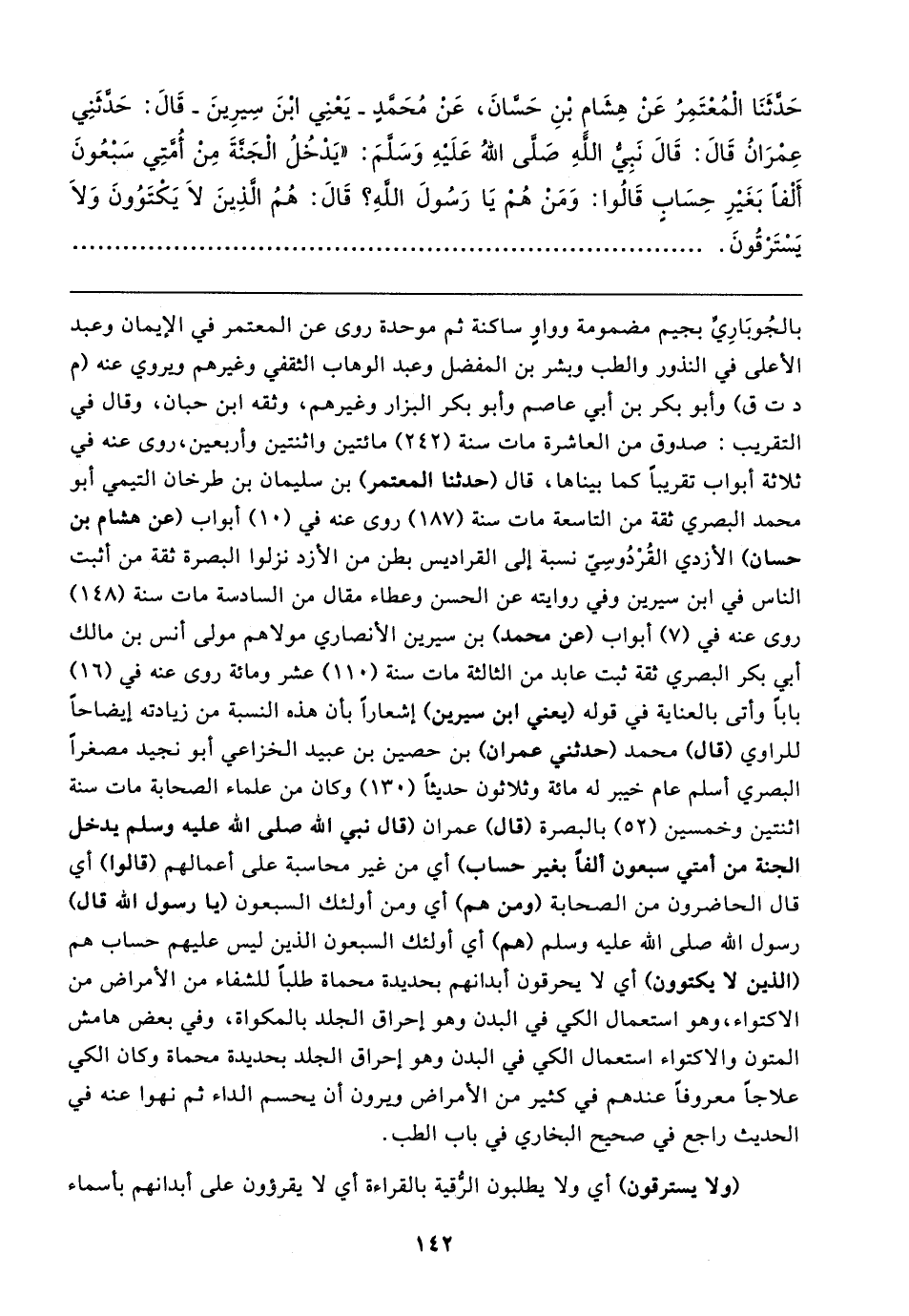 حَدَّثَنَا الْمُعتَمِرُ عَنْ هِشَام بنِ حَسَّانَ، عَن مُحَمد -يَعْنِي ابنَ سِيرِينَ- قَال: حَدثَنِي عِمْرَانُ قَال: قَال نَبِيُّ اللهِ صلى اللهُ عَلَيهِ وَسَلمَ: "يَدْخُلُ الْجَنَّةَ مِنْ أُمتِي سَبْعُونَ أَلْفًا بَغَيرِ حِسَابٍ قَالُوا: وَمَن هُمْ يَا رَسُولَ الله؟ قَال: هُمُ الذِينَ لَا يَكتَوُونَ وَلَا يَسْتَرْقُونَ