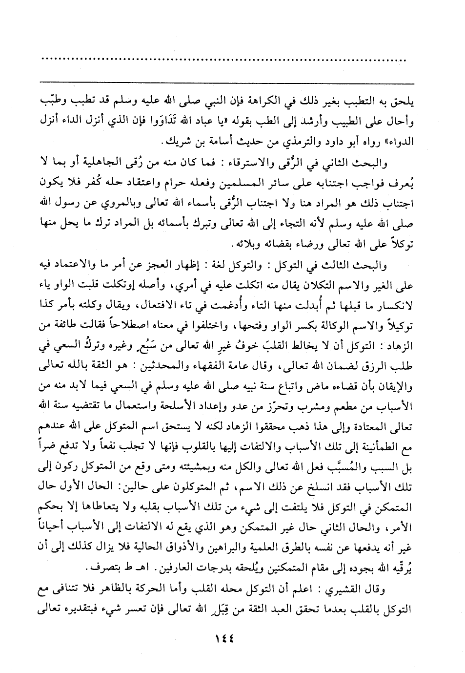 والبحث الثالث في التوكل: والتوكل لغة: إظهار العجز عن أمر ما والاعتماد فيه على الغير والاسم التكلان يقال منه اتكلت عليه في أمري، وأصله إوتكلت قلبت الواو ياء لانكسار ما قبلها ثم أبدلت منها التاء وأُدغمت في تاء الافتعال، ويقال وكلته بأمر كذا توكيلًا والاسم الوكالة بكسر الواو وفتحها، واختلفوا في معناه اصطلاحًا فقالت طائفة من الزهاد: التوكل أن لا يخالط القلبَ خوفُ غيرِ الله تعالى من سَبُعٍ وغيره وتركُ السعي في طلب الرزق لضمان الله تعالى، وقال عامة الفقهاء والمحدثين: هو الثقة بالله تعالى والإيقان بأن قضاءه ماض واتباع سنة نبيه صلى الله عليه وسلم في السعي فيما لا بد منه من الأسباب من مطعم ومشرب وتحزز من عدو وإعداد الأسلحة واستعمال ما تقتضيه سنة الله تعالى المعتادة وإلى هذا ذهب محققوا الزهاد لكنه لا يستحق اسم المتوكل على الله عندهم مع الطمأنينة إلى تلك الأسباب والالتفات إليها بالقلوب فإنها لا تجلب نفعًا ولا تدفع ضرًّا بل السبب والمُسبب فعل الله تعالى والكل منه وبمشيئته ومتى وقع من المتوكل ركون إلى تلك الأسباب فقد انسلخ عن ذلك الاسم، ثم المتوكلون على حالين: الحال الأول حال المتمكن في التوكل فلا يلتفت إلى شيء من تلك الأسباب بقلبه ولا يتعاطاها إلا بحكم الأمر، والحال الثاني حال غير المتمكن وهو الذي يقع له الالتفات إلى الأسباب أحيانًا غير أنه يدفعها عن نفسه بالطرق العلمية والبراهين والأذواق الحالية فلا يزال كذلك إلى أن يُرقيه الله بجوده إلى مقام المتمكنين ويُلحقه بدرجات العارفين. اهـ ط بتصرف.