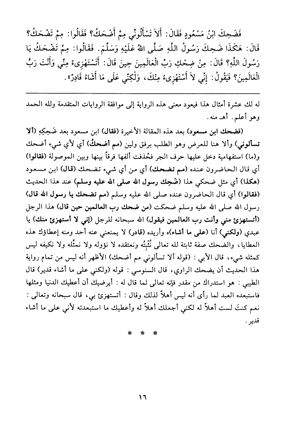 فَضَحِكَ ابْنُ مَسْعُوْدٍ فَقَال: أَلا تَسْأَلُوْنِي مِمَّ أضْحَكُ؟ فقالوا: مِمَّ تَضْحَكُ؟ قَال: هَكَذَا ضَحِكَ رَسُولُ اللَّهِ صَلَّى اللَّهُ عَلَيهِ وَسَلَّمَ، فَقَالُوا: مِمَّ تَضْحَكُ يَا رَسُوْلَ اللَّهِ؟ ، قَال: مِنْ ضَحِكِ رَبِّ العَالمِينَ حِينَ قَال: أتَسْتَهْزئُ منِّي وَأنْتَ رَبُّ العَالمِينَ؟ فَيَقُوْلُ: إنِّي لَا أسْتَهْزِئُ مِنْكَ، وَلَكِنِّي عَلَى مَا أشَاءُ قَادِرٌ"