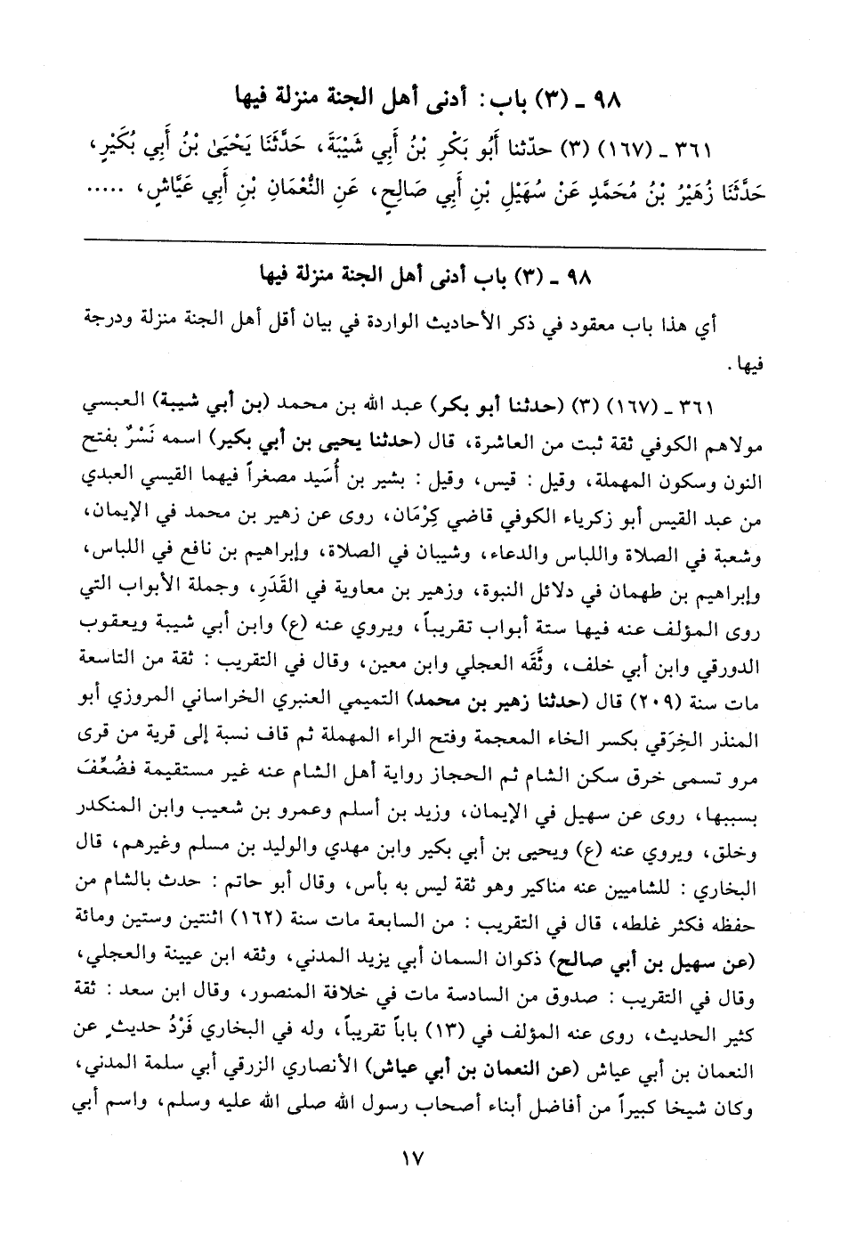 ٣٦١ - (١٦٧) (٣) حدَّثنا أَبُو بَكْرِ بن أبِي شَيبَةَ، حَدَّثَنَا يَحْيَى بْنُ أَبِي بُكَيرٍ، حَدَّثَنَا زُهَيرُ بن مُحَمَّدٍ عَنْ سُهَيلِ بْنِ أَبِي صَالِحٍ، عَنِ النُّعْمَانِ بْنِ أَبِي عَيَّاش،