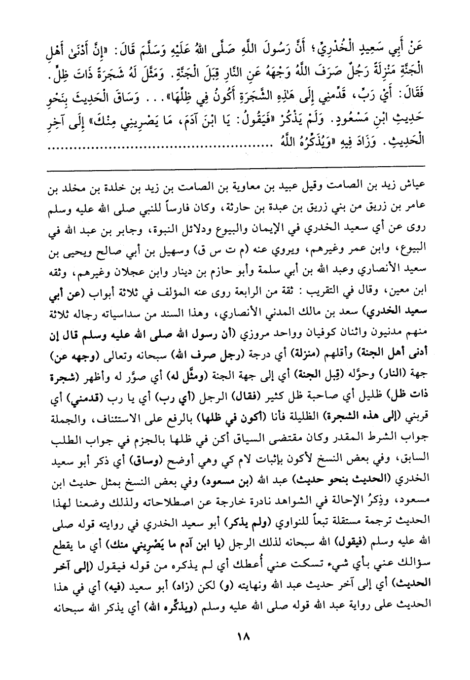 عياش زيد بن الصامت وقيل عبيد بن معاوية بن الصامت بن زيد بن خلدة بن مخلد بن عامر بن زريق من بني زريق بن عبدة بن حارثة، وكان فارسًا للنبي صلى الله عليه وسلم روى عن أبي سعيد الخدري في الإيمان والبيوع ودلائل النبوة، وجابر بن عبد الله في البيوع، وابن عمر وغيرهم، ويروي عنه (م ت س ق) وسهيل بن أبي صالح ويحيى بن سعيد الأنصاري وعبد الله بن أبي سلمة وأبو حازم بن دينار وابن عجلان وغيرهم، وثقه ابن معين، وقال في التقريب: ثقة من الرابعة روى عنه المؤلف في ثلاثة أبواب (عن أبي سعيد الخدري) سعد بن مالك المدني الأنصاري، وهذا السند من سداسياته رجاله ثلاثة منهم مدنيون واثنان كوفيان وواحد مروزي (أن رسول الله صلى الله عليه وسلم قال إن أدنى أهل الجنة) وأقلهم (منزلة) أي درجة (رجل صرف الله) سبحانه وتعالى (وجهه عن) جهة (النار) وحوَّله (قِبل الجنة) أي إلى جهة الجنة (ومثَّل له) أي صوَّر له وأظهر (شجرة ذات ظل) ظليل أي صاحبة ظل كثير (فقال) الرجل (أي رب) أي يا رب (قدمني) أي قربني (إلى هذه الشجرة) الظليلة فأنا (أكون في ظلها) بالرفع على الاستئناف، والجملة جواب الشرط المقدر وكان مقتضى السياق أكن في ظلها بالجزم في جواب الطلب السابق، وفي بعض النسخ لأكون بإثبات لام كي وهي أوضح (وساق) أي ذكر أبو سعيد الخدري (الحديث بنحو حديث) عبد الله (بن مسعود) وفي بعض النسخ بمثل حديث ابن مسعود، وذِكرُ الإحالة في الشواهد نادرة خارجة عن اصطلاحاته ولذلك وضعنا لهذا الحديث ترجمة مستقلة تبعًا للنواوي (ولم يذكر) أبو سعيد الخدري في روايته قوله صلى الله عليه وسلم (فيقول) الله سبحانه لذلك الرجل (يا ابن آدم ما يَصْرِيني منك) أي ما يقطع سؤالك عني بأي شيء تسكت عني أُعطك أي لم يذكره من قوله فيقول (إلى آخر الحديث) أي إلى آخر حديث عبد الله ونهايته (و) لكن (زاد) أبو سعيد (فيه) أي في هذا الحديث على رواية عبد الله قوله صلى الله عليه وسلم (وبذكره الله) أي يذكر الله سبحانه