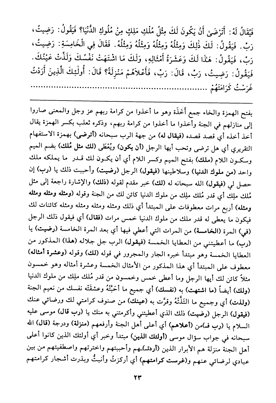 فَيُقَالُ لَهُ: أَتَرْضَى أَنْ يَكُونَ لَكَ مِثْلُ مُلْكِ مَلِكٍ مِنْ مُلُوكِ الدُّنْيَا؟ فَيَقُولُ: رَضِيتُ, رَبِّ، فَيَقُولُ: لَكَ ذَلِكَ وَمِثْلُهُ وَمِثْلُهُ وَمِثْلُهُ وَمِثْلُهُ. فَقَال: فِي الْخَامِسَةِ رَضِيتُ, رَبِّ، فَيَقُولُ: هَذَا لَكَ وَعَشَرَةُ أَمْثَالِهِ، وَلَكَ مَا اشْتَهَتْ نَفْسُكَ وَلَذَّتْ عَينُكَ. فَيَقُولُ: رَضِيتُ, رَبِّ، قَال: رَبِّ, فَأَعْلَاهُمْ مَنْزِلَةً؟ قَال: أُولَئِكَ الَّذِينَ أَرَدْتُ غَرَسْتُ كَرَامَتَهُمْ
