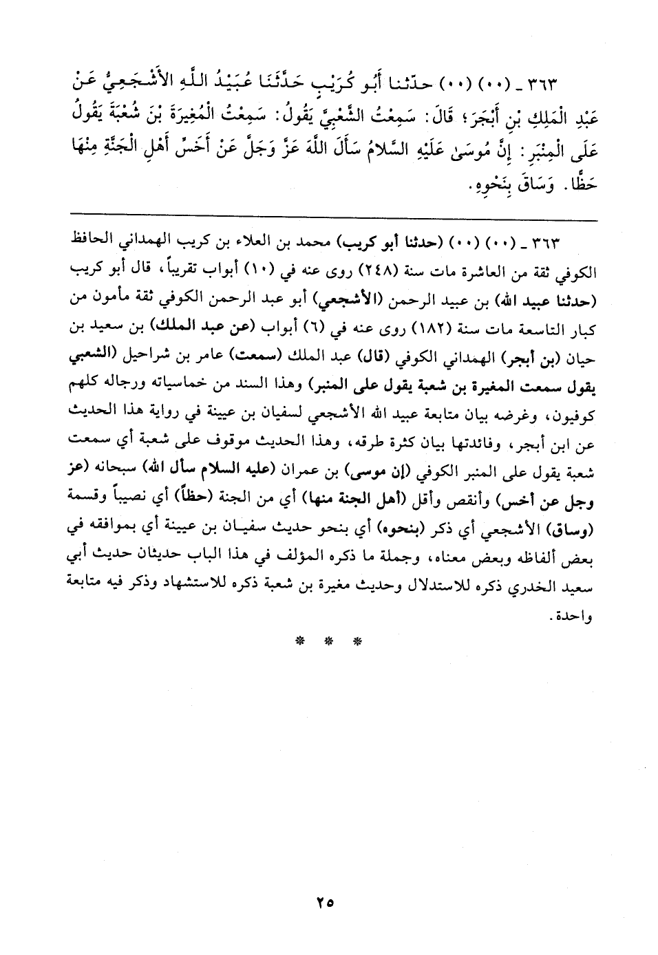 ٣٦٣ - (٠٠) (٠٠) (حدثنا أبو كريب) محمد بن العلاء بن كريب الهمداني الحافظ الكوفي ثقة من العاشرة مات سنة (٢٤٨) روى عنه في (١٠) أبواب تقريبًا، قال أبو كريب (حدثنا عبيد الله) بن عبيد الرحمن (الأشجعي) أبو عبد الرحمن الكوفي ثقة مأمون من كبار التاسعة مات سنة (١٨٢) روى عنه في (٦) أبواب (عن عبد الملك) بن سعيد بن حيان (بن أبجر) الهمداني الكوفي (قال) عبد الملك (سمعت) عامر بن شراحيل (الشعبي يقول سمعت المغيرة بن شعبة يقول على المنبر) وهذا السند من خماسياته ورجاله كلهم كوفيون، وغرضه بيان متابعة عبيد الله الأشجعي لسفيان بن عيينة في رواية هذا الحديث عن ابن أبجر، وفائدتها بيان كثرة طرقه، وهذا الحديث موقوف على شعبة أي سمعت شعبة يقول على المنبر الكوفي (أن موسى) بن عمران (- عليه السلام - سأل الله) سبحانه (عز وجل عن أخس) وأنقص وأقل (أهل الجنة منها) أي من الجنة (حظًّا) أي نصيبًا وقسمة (وساق) الأشجعي أي ذكر (بنحوه) أي بنحو حديث سفيان بن عيينة أي بموافقه في بعض ألفاظه وبعض معناه، وجملة ما ذكره المؤلف في هذا الباب حديثان حديث أبي سعيد الخدري ذكره للاستدلال وحديث مغيرة بن شعبة ذكره للاستشهاد وذكر فيه متابعة واحدة.