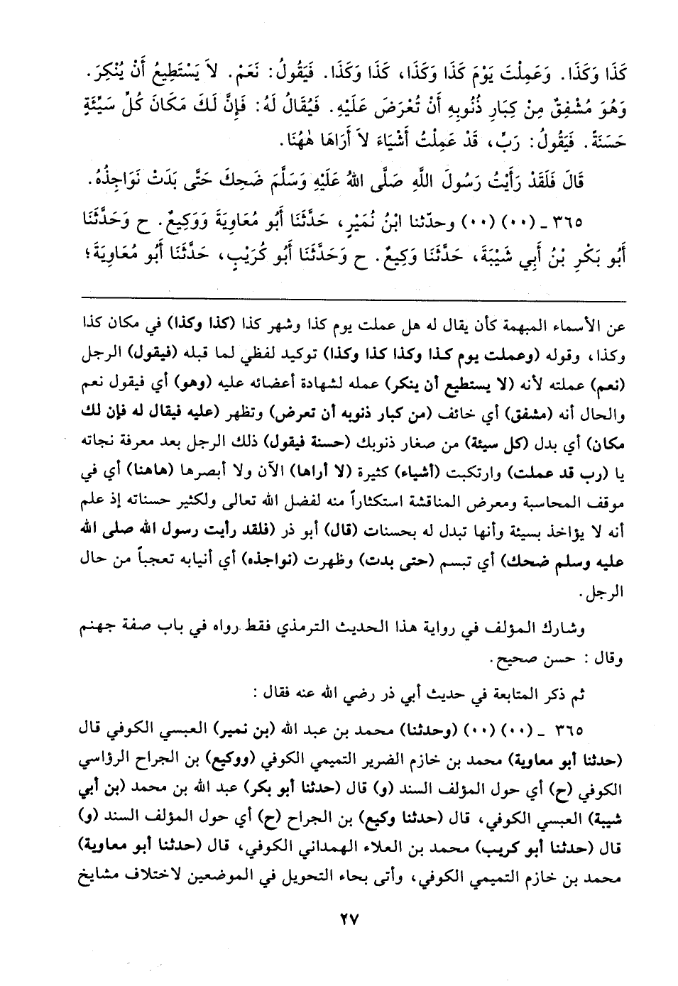 ٣٦٥ - (٠٠) (٠٠) (وحدثنا) محمد بن عبد الله (بن نمير) العبسي الكوفي قال (حدثنا أبو معاوية) محمد بن خازم الضرير التميمي الكوفي (ووكيع) بن الجراح الرؤاسي الكوفي (ح) أي حول المؤلف السند (و) قال (حدثنا أبو بكر) عبد الله بن محمد (بن أبي شيبة) العبسي الكوفي، قال (حدثنا وكيع) بن الجراح (ح) أي حول المؤلف السند (و) قال (حدثنا أبو كريب) محمد بن العلاء الهمداني الكوفي، قال (حدثنا أبو معاوية) محمد بن خازم التميمي الكوفي، وأتى بحاء التحويل في الموضعين لاختلاف مشايخ