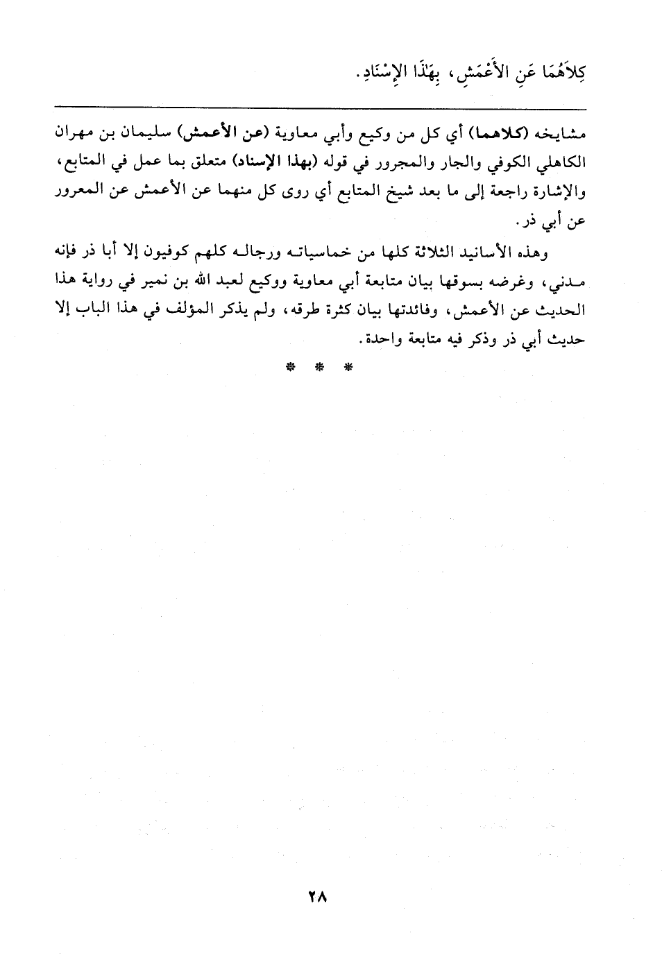 وهذه الأسانيد الثلاثة كلها من خماسياته ورجاله كلهم كوفيون إلا أبا ذر فإنه مدني، وغرضه بسوقها بيان متابعة أبي معاوية ووكيع لعبد الله بن نمير في رواية هذا الحديث عن الأعمش، وفائدتها بيان كثرة طرقه، ولم يذكر المؤلف في هذا الباب إلا حديث أبي ذر وذكر فيه متابعة واحدة.