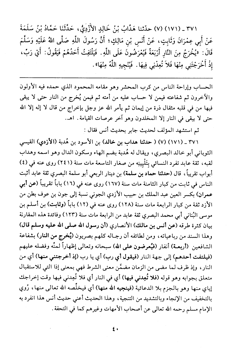 ٣٧١ - (١٧١) (٧) (حدثنا هداب بن خالد) بن الأسود بن هُدبة (الأزدي) القيسي الثوباني أبو خالد البصري، ويقال له هُدبة بضم الهاء وسكون الدال وهو اسمه وهداب لقبه، ثقة عابد تفرد النسائي بِتَلْيِينِه من صغار التاسعة مات سنة (٢٤١) روى عنه في (٤) أبواب تقريبًا، قال (حدثنا حماد بن سلمة) بن دينار الربعي أبو سلمة البصري ثقة عابد أثبت الناس في ثابت من كبار الثامنة مات سنة (١٦٧) روى عنه في (١٦) بابًا تقريبًا (عن أبي عمران) بكسر العين عبد الملك بن حبيب الأزدي الجوني نسبة إلى جون بن عوف بطن من الأزد ثقة من كبار الرابعة مات سنة (١٢٨) روى عنه في (١٢) بابا (وثابت) بن أسلم بن موسى البُناني أبي محمد البصري ثقة عابد من الرابعة مات سنة (١٢٣) وفائدة هذه المقارنة بيان كثرة طرقه (عن أنس بن مالك) الأنصاري (أن رسول الله صلى الله عليه وسلم قال) وهذا السند من رباعياته، ومن لطائفه أن رجاله كلهم بصريون (يُخرج من النار) بشفاعة الشافعين (أربعة) أنفار (فيُعرضون على الله) سبحانه وتعالى إظهارًا لمنِّه وفضله عليهم (فيلتفت أحدهم) إلى جهة النار (فيقول أي رب) أي يا رب (إذ أخرجتني منها) أي من النار، وإذ ظرف لما مضى من الزمان مضمَّن معنى الشرط فهي بمعنى إذا التي للاستقبال متعلق بجوابه وهو قوله (فلا تُعِدني فيها) أي في النار أي فلا تُعِدني فيها وقت إخراجك إياي منها وهو بالجزم بلا الدعائية (فينجيه الله منها) أي فيخلِّصه الله تعالى منها، رُوي بالتخفيف من الإنجاء وبالتثديد من التنجية، وهذا الحديث أعني حديث أنس هذا انفرد به الإمام مسلم رحمه الله تعالى عن أصحاب الأمهات وغيرهم كما في التحفة.