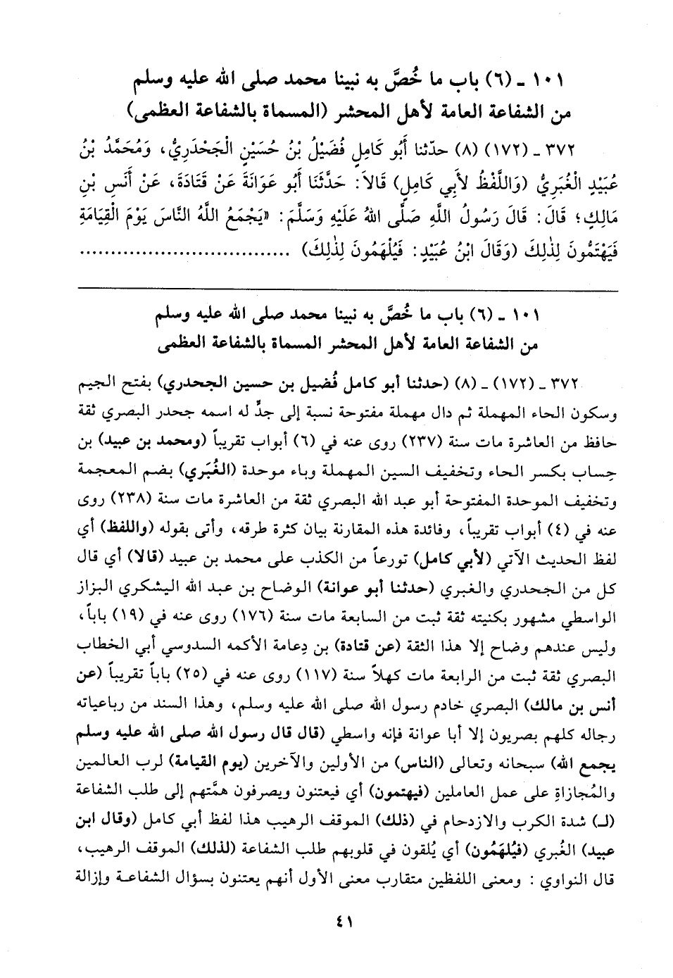 ٣٧٢ - (١٧٢) - (٨) (حدثنا أبو كامل فُضيل بن حسين الجحدري) بفتح الجيم وسكون الحاء المهملة ثم دال مهملة مفتوحة نسبة إلى جدٍّ له اسمه جحدر البصري ثقة حافظ من العاشرة مات سنة (٢٣٧) روى عنه في (٦) أبواب تقريبًا (ومحمد بن عبيد) بن حِساب بكسر الحاء وتخفيف السين المهملة وباء موحدة (الغُبَري) بضم المعجمة وتخفيف الموحدة المفتوحة أبو عبد الله البصري ثقة من العاشرة مات سنة (٢٣٨) روى عنه في (٤) أبواب تقريبًا، وفائدة هذه المقارنة بيان كثرة طرقه، وأتى بقوله (واللفظ) أي لفظ الحديث الآتي (لأبي كامل) تورعًا من الكذب على محمد بن عبيد (قالا) أي قال كل من الجحدري والغبري (حدثنا أبو عوانة) الوضاح بن عبد الله اليشكري البزاز الواسطي مشهور بكنيته ثقة ثبت من السابعة مات سنة (١٧٦) روى عنه في (١٩) بابا، وليس عندهم وضاح إلا هذا الثقة (عن قتادة) بن دِعامة الأكمه السدوسي أبي الخطاب البصري ثقة ثبت من الرابعة مات كهلًا سنة (١١٧) روى عنه في (٢٥) بابًا تقريبًا (عن أنس بن مالك) البصري خادم رسول الله صلى الله عليه وسلم، وهذا السند من رباعياته رجاله كلهم بصريون إلا أبا عوانة فإنه واسطي (قال قال رسول الله صلى الله عليه وسلم يجمع الله) سبحانه وتعالى (الناس) من الأولين والآخرين (يوم القيامة) لرب العالمين والمُجازاةِ على عمل العاملين (فيهتمون) أي فيعتنون ويصرفون همَّتهم إلى طلب الشفاعة (لـ) شدة الكرب والازدحام في (ذلك) الموقف الرهيب هذا لفظ أبي كامل (وقال ابن عبيد) الغُبري (فيُلهَمُون) أي يُلقون في قلوبهم طلب الشفاعة (لذلك) الموقف الرهيب، قال النواوي: ومعنى اللفظين متقارب معنى الأول أنهم يعتنون بسؤال الشفاعة وإزالة
