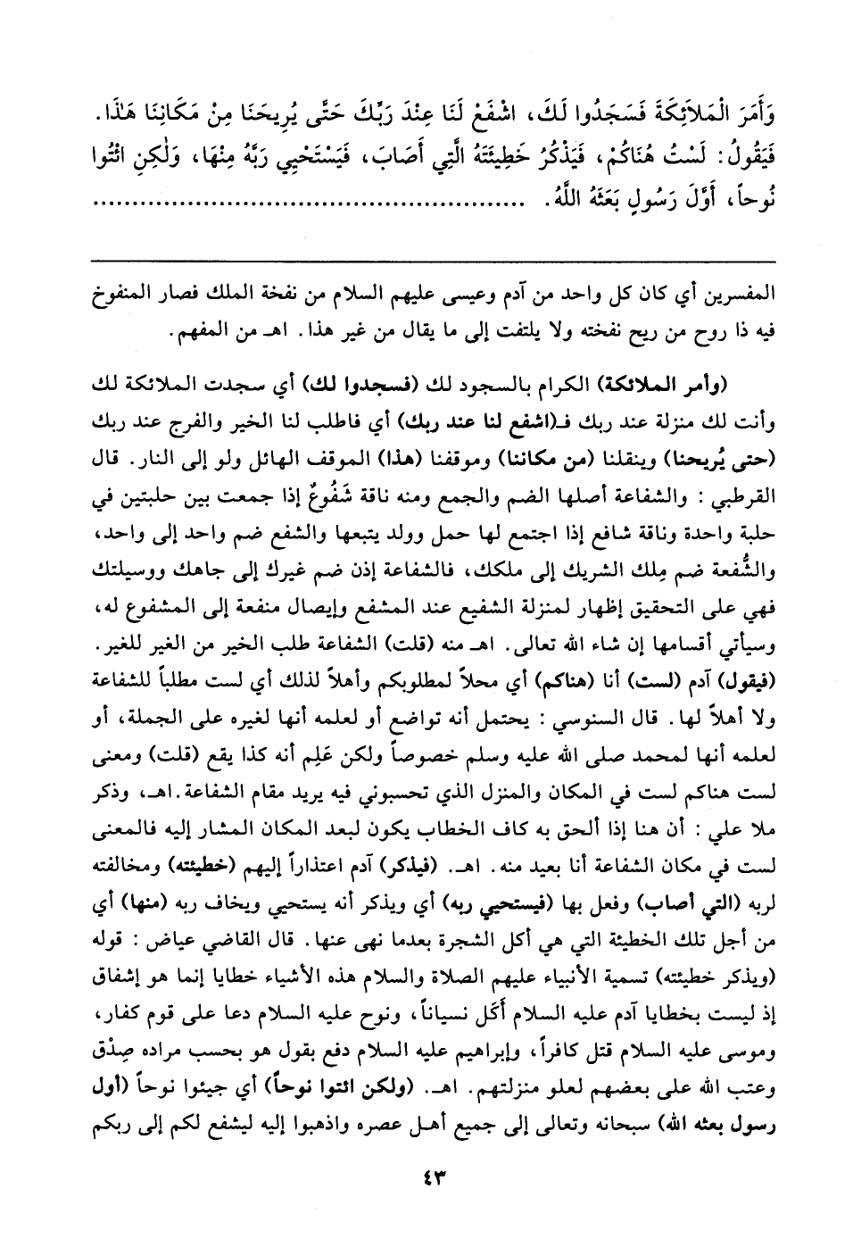 (وأمر الملائكة) الكرام بالسجود لك (فسجدوا لك) أي سجدت الملائكة لك وأنت لك منزلة عند ربك فـ (اشفع لنا عند ربك) أي فاطلب لنا الخير والفرج عند ربك (حتى يُريحنا) وينقلنا (من مكاننا) وموقفنا (هذا) الموقف الهائل ولو إلى النار. قال القرطبي: والشفاعة أصلها الضم والجمع ومنه ناقة شَفُوعٌ إذا جمعت بين حلبتين في حلبة واحدة وناقة شافع إذا اجتمع لها حمل وولد يتبعها والشفع ضم واحد إلى واحد، والشُّفعة ضم مِلك الشريك إلى ملكك، فالشفاعة إذن ضم غيرك إلى جاهك ووسيلتك فهي على التحقيق إظهار لمنزلة الشفيع عند المشفع وإيصال منفعة إلى المشفوع له، وسيأتي أقسامها إن شاء الله تعالى. اهـ منه (قلت) الشفاعة طلب الخير من الغير للغير. (فيقول) آدم (لست) أنا (هناكم) أي محلًا لمطلوبكم وأهلًا لذلك أي لست مطلبًا للشفاعة ولا أهلًا لها. قال السنوسي: يحتمل أنه تواضع أو لعلمه أنها لغيره على الجملة، أو لعلمه أنها لمحمد صلى الله عليه وسلم خصوصًا ولكن عَلِم أنه كذا يقع (قلت) ومعنى لست هناكم لست في المكان والمنزل الذي تحسبوني فيه يريد مقام الشفاعة. اهـ، وذكر ملا علي: أن هنا إذا ألحق به كاف الخطاب يكون لبعد المكان المشار إليه فالمعنى لست في مكان الشفاعة أنا بعيد منه. اهـ. (فيذكر) آدم اعتذارًا إليهم (خطيئته) ومخالفته لربه (التي أصاب) وفعل بها (فيستحيي ربه) أي ويذكر أنه يستحى ويخاف ربه (منها) أي من أجل تلك الخطيئة التي هي أكل الشجرة بعدما نهى عنها. قال القاضي عياض: قوله (ويذكر خطيئته) تسمية الأنبياء عليهم الصلاة والسلام هذه الأشياء خطايا إنما هو إشفاق إذ ليست بخطايا آدم - عليه السلام - أكَل نسيانًا، ونوح - عليه السلام - دعا على قوم كفار، وموسى - عليه السلام - قتل كافرًا، وإبراهيم - عليه السلام - دفع بقول هو بحسب مراده صِدْق وعتب الله على بعضهم لعلو منزلتهم. اهـ. (ولكن ائتوا نوحًا) أي جيئوا نوحًا (أول رسول بعثه الله) سبحانه وتعالى إلى جميع أهل عصره واذهبوا إليه ليشفع لكم إلى ربكم