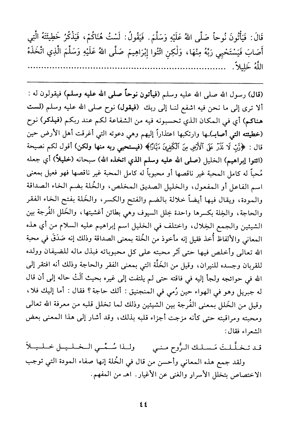 (قال) رسول الله صلى الله عليه وسلم (فيأتون نوحًا صلى الله عليه وسلم) فيقولون له: ألا ترى إلى ما نحن فيه اشفع لنا إلى ربك (فيقول) نوح صلى الله عليه وسلم (لست هناكم) أي في المكان الذي تحسبونه فيه من الشفاعة لكم عند ربكم (فيذكر) نوح (خطيئته التي أصابـ) ـها وارتكبها اعتذارًا إليهم وهي دعوته التي أغرقت أهل الأرض حين قال: {رَبِّ لَا تَذَرْ عَلَى الْأَرْضِ مِنَ الْكَافِرِينَ دَيَّارًا} (فيستحيي ربه منها ولكن) أقول لكم نصيحة (ائتوا إبراهيم) الخليل (صلى الله عليه وسلم الذي اتخذه الله) سبحانه (خليلًا) أي جعله مُحبًا له كامل المحبة غير ناقصها أو محبوبًا له كامل المحبة غير ناقصها فهو فعيل بمعنى اسم الفاعل أو المفعول، والخليل الصديق المخلص، والخُلة بضم الخاء الصداقة والمودة، ويقال فيها أيضًا خلالة بالضم والفتح والكسر، والخَلة بفتح الخاء الفقر والحاجة، والخِلة بكسرها واحدة خِلل السيوف وهي بطائن أغشيتها، والخَلل الفُرجة بين الشيئين والجمع الخِلال، واختلف في الخليل اسم إبراهيم - عليه السلام - من أي هذه المعاني والألفاظ أُخذ فقيل إنه مأخوذ من الخُلة بمعنى الصداقة وذلك إنه صَدَقَ في محبة الله تعالى وأخلص فيها حتى آثر محبته على كل محبوباته فبذل ماله للضيفان وولده للقربان وجسده للنيران، وقيل من الخَلَّة التي بمعنى الفقر والحاجة وذلك أنه افتقر إلى الله في حوائجه ولجأ إليه في فاقته حتى لم يلتفت إلى غيره بحيث آلَتْ حاله إلى أن قال له جبريل وهو في الهواء حين رُمي في المنجنيق: ألك حاجة؟ فقال: أما إليك فلا، وقيل من الخَلل بمعنى الفُرجة بين الشيئين وذلك لما تخلل قلبه من معرفة الله تعالى ومحبته ومراقبته حتى كأنه مزجت أجزاء قلبه بذلك، وقد أشار إلى هذا المعنى بعض الشعراء فقال: