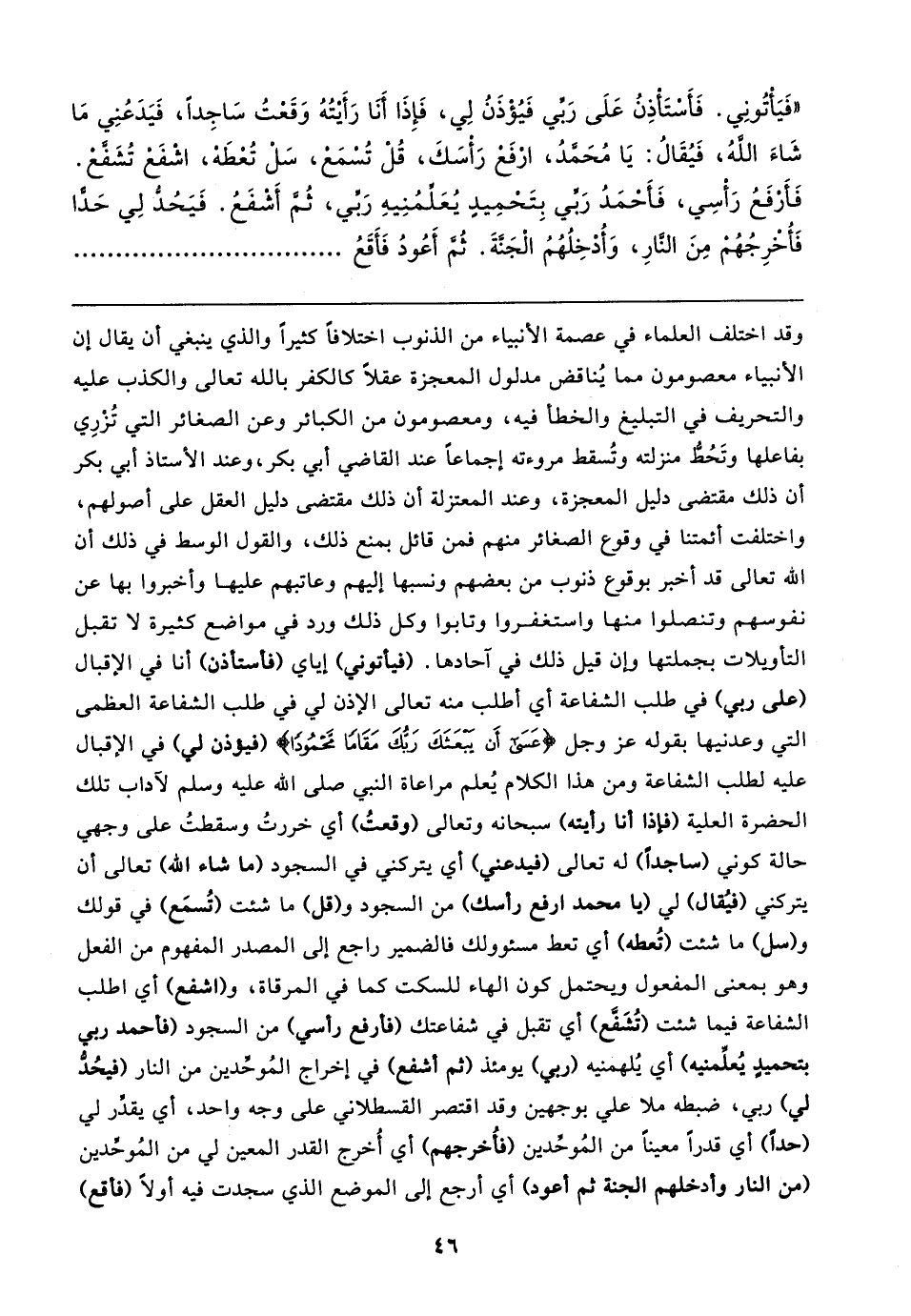 وقد اختلف العلماء في عصمة الأنبياء من الذنوب اختلافًا كثيرًا والذي ينبغي أن يقال إن الأنبياء معصومون مما يُناقض مدلول المعجزة عقلًا كالكفر بالله تعالى والكذب عليه والتحريف في التبليغ والخطأ فيه، ومعصومون من الكبائر وعن الصغائر التي تُزْرِي بفاعلها وتَحُطُّ منزلته وتُسقط مروءته إجماعًا عند القاضي أبي بكر، وعند الأستاذ أبي بكر أن ذلك مقتضى دليل المعجزة، وعند المعتزلة أن ذلك مقتضى دليل العقل على أصولهم، واختلفت أئمتنا في وقوع الصغائر منهم فمن قائل بمنع ذلك، والقول الوسط في ذلك أن الله تعالى قد أخبر بوقوع ذنوب من بعضهم ونسبها إليهم وعاتبهم عليها وأخبروا بها عن نفوسهم وتنصلوا منها واستغفروا وتابوا وكل ذلك ورد في مواضع كثيرة لا تقبل التأويلات بجملتها وإن قيل ذلك في آحادها. (فيأتوني) إياي (فأستأذن) أنا في الإقبال (على ربي) في طلب الشفاعة أي أطلب منه تعالى الإذن لي في طلب الشفاعة العظمى التي وعدنيها بقوله عزَّ وجلَّ {عَسَى أَنْ يَبْعَثَكَ رَبُّكَ مَقَامًا مَحْمُودًا} (فيؤذن لي) في الإقبال عليه لطلب الشفاعة ومن هذا الكلام يُعلم مراعاة النبي صلى الله عليه وسلم لآداب تلك الحضرة العلية (فإذا أنا رأيته) سبحانه وتعالى (وقعتُ) أي خررتُ وسقطتُ على وجهي حالة كوني (ساجدًا) له تعالى (فيدعني) أي يتركني في السجود (ما شاء الله) تعالى أن يتركني (فيُقال) لي (يا محمد ارفع رأسك) من السجود و (قل) ما شئت (تُسمَع) في قولك و (سل) ما شئت (تُعطه) أي تعط مسئوولك فالضمير راجع إلى المصدر المفهوم من الفعل وهو بمعنى المفعول ويحتمل كون الهاء للسكت كما في المرقاة، و (اشفع) أي اطلب الشفاعة فيما شئت (تُشَفَّع) أي تقبل في شفاعتك (فأرفع رأسي) من السجود (فأحمد ربي بتحميدٍ يُعلِّمنيه) أي يُلهمنيه (ربي) يومئذ (ثم أشفع) في إخراج المُوحِّدين من النار (فيحُدُّ لي) ربي، ضبطه ملا علي بوجهين وقد اقتصر القسطلاني على وجه واحد، أي يقدِّر لي (حدًّا) أي قدرًا معينًا من المُوحِّدين (فأُخرجهم) أي أُخرج القدر المعين لي من المُوحِّدين (من النار وأدخلهم الجنة ثم أعود) أي أرجع إلى الموضع الذي سجدت فيه أولًا (فأقع)