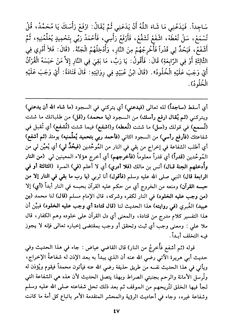 سَاجِدًا، فَيَدَعُنِي مَا شَاءَ اللَّهُ أَنْ يَدَعَنِي، ثُمَّ يُقَالُ: ارْفَعْ رَأْسَكَ يَا مُحَمَّدُ، قُلْ تُسْمَعْ , سَلْ تُعْطَهْ، اشْفَعْ تُشَفَّعْ، فَأَرْفَعُ رَأْسِي، فَأَحْمَدُ رَبِّي بِتَحْمِيدٍ يُعَلِّمُنِيهِ، ثُمَّ أَشْفَعُ، فَيَحُدُّ لِي قَدْرًا فَأُخْرِجَهُمْ مِنَ النَّارِ، وَأُدْخِلُهُمُ الْجَنَّةَ، (قَال: فَلَا أَدْرِي فِي الثَّالِثَةِ أَوْ فِي الرَّابِعَةِ) قَال: فَأَقُولُ: يَا رَبِّ، مَا بَقِيَ فِي النَّارِ إلا مَنْ حَبَسَهُ الْقُرْآنُ أَي وَجَبَ عَلَيهِ الْخُلُودُ"، (قَال ابْنُ عُبَيدٍ فِي رِوَايَتِهِ: قَال قَتَادَةُ: أَي وَجَبَ عَلَيهِ الْخُلُودُ)