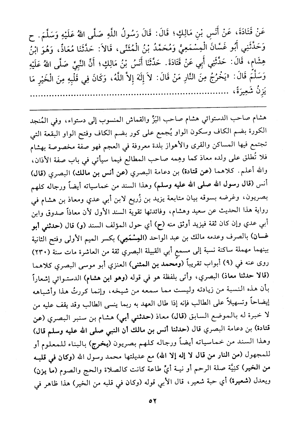 عَنْ قَتَادَةَ، عَنْ أَنَسِ بنِ مَالِكٍ؛ قَال: قَال رَسُولُ اللهِ صَلَّى اللهُ عَلَيهِ وَسَلَّمَ. ح وَحَدَّثَنِي أَبُو غَسَّانَ الْمِسْمَعِيُّ وَمُحَمَّدُ بْنُ الْمُثَنَّى، قَالا: حَدَّثَنَا مُعَاذ، وَهُوَ ابْنُ هِشَامٍ، قَال: حَدَّثَنِي أَبِي عَنْ قَتَادَةَ. حَدَّثَنَا أَنَسُ بْنُ مَالِكٍ؛ أَنَّ النَّبِيَّ صَلَّى اللهُ عَلَيهِ وَسَلَّمَ قَال: "يَخْرُجُ مِنَ النَّارِ مَنْ قَال: لَا إِلَةَ إلَّا اللهُ، وَكَانَ فِي قَلْبِهِ مِنَ الْخَيرِ مَا يَزِنُ شَعِيرَةً،